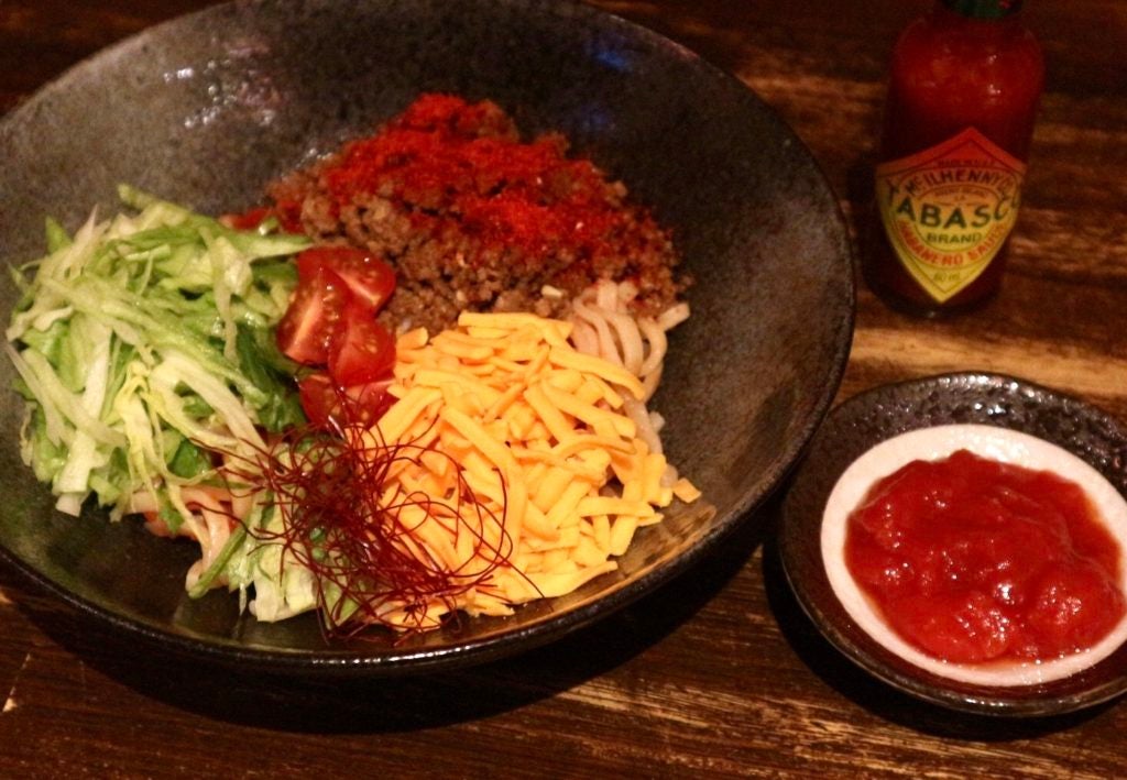 冷たい沖縄そばにはピリ辛い味付けをし、スパイシーなタコスミートは辛さに負けないコクがあります。