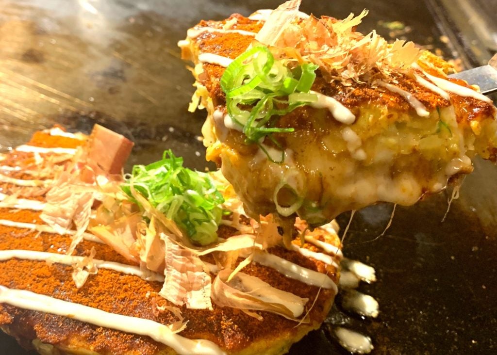 ふっくらと焼き上げる人気のチーズとお餅のお好み焼きに、ハバネロなど数種類のオリジナルスパイスをたっぷりと使った激辛お好み焼き。