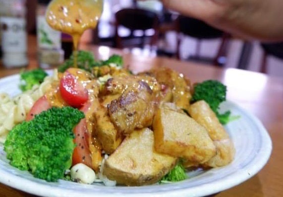 韓国唐辛子、豆板醤・花山椒で辛みを効かせた自家製辣油に、3種のオーガニックビネガーに胡麻、天然醸造仕込みの味噌とこだわりの素材を使用し、辛みと酸味のバランスが素晴らしいザクザクっと粗みじんの玉ねぎがたっぷり入った特製のごまスーラーたれをドレッシング代りに使用しています。