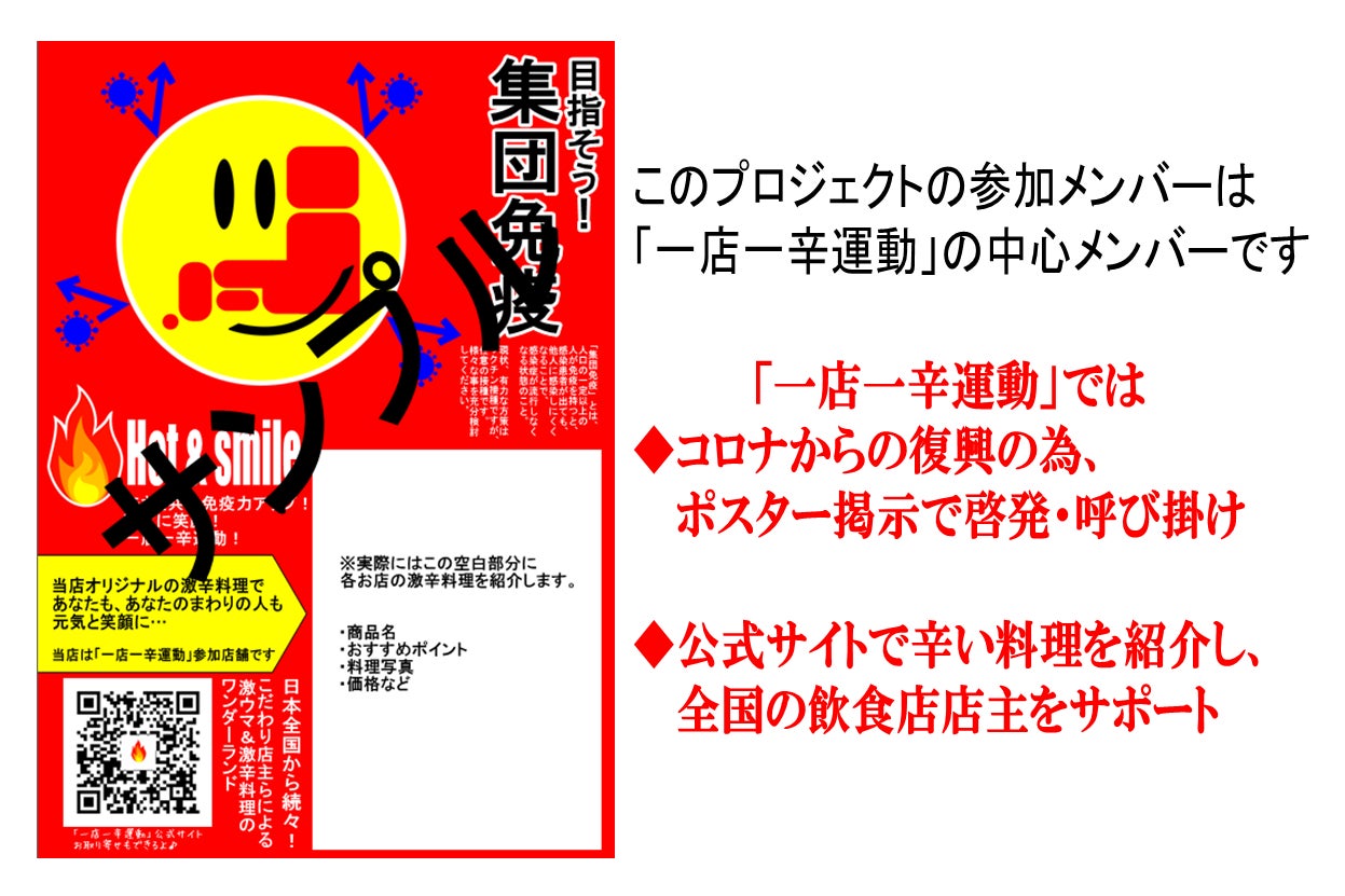 今の空気感を変える1つとして、何かできないか?と考え、[免疫=辛い料理]と絡めてユニークさを持って、各店が独自の激辛料理と共に伝えようと「一店一辛運動」が始め、各店で共通のポスターと共に、 一店一辛運動の公式サイト にて激辛料理を紹介しております。