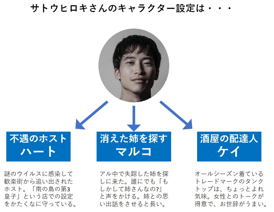 その役は3つの設定から「クラウドファンディング中の人気投票」で決まります!ご支援時、備考欄に「〇〇役希望」と書き添えてください!(または事務局からご案内するアンケートにご回答ください)
