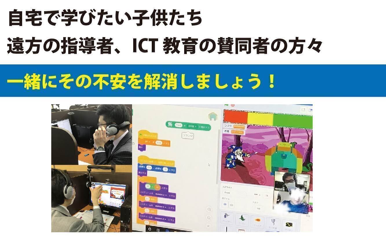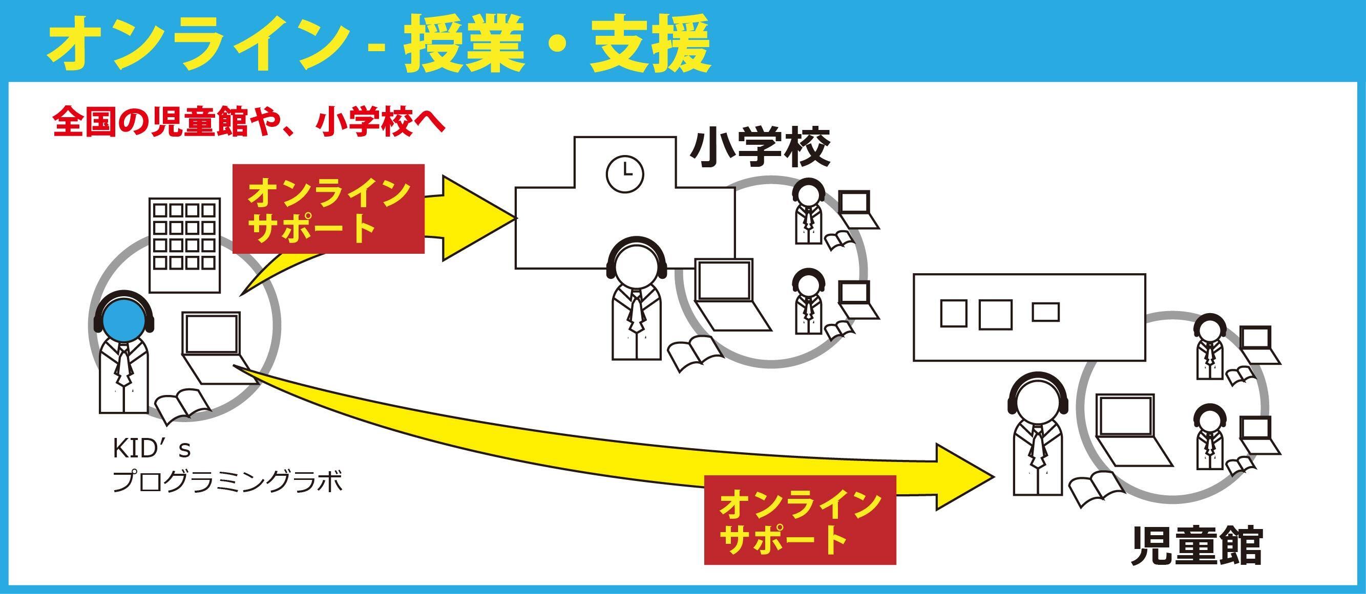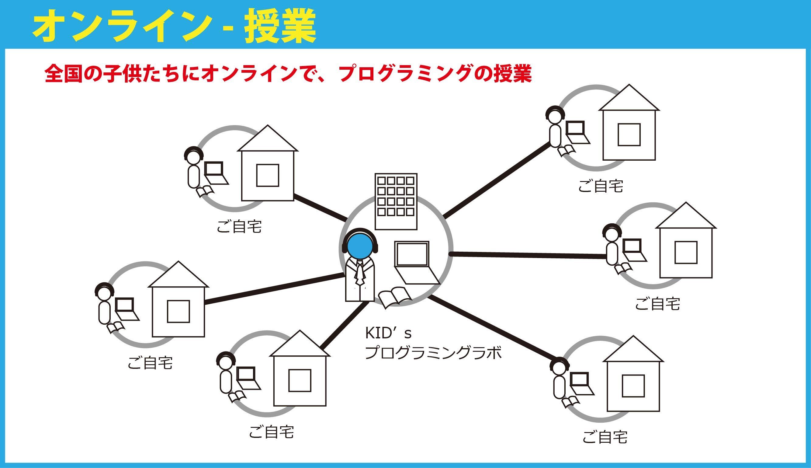 Kid'sプログラミングラボのスタッフが、「各家庭」にzoomを用いて、オンラインでサポートを行います。サポートを行うご家庭には、zoomが利用できる環境(ネット環境)と「プログラミング支援ソフト - Scratch」 を使用できるパソコン環境が必要となります。