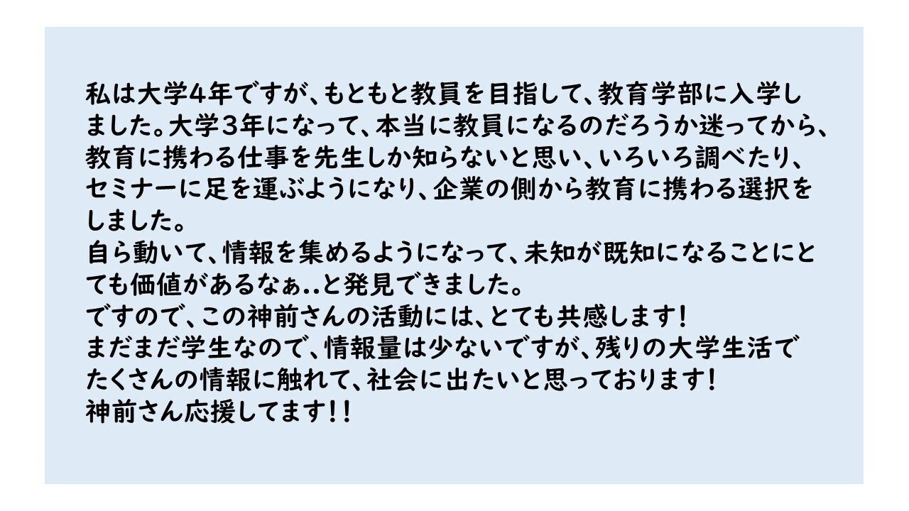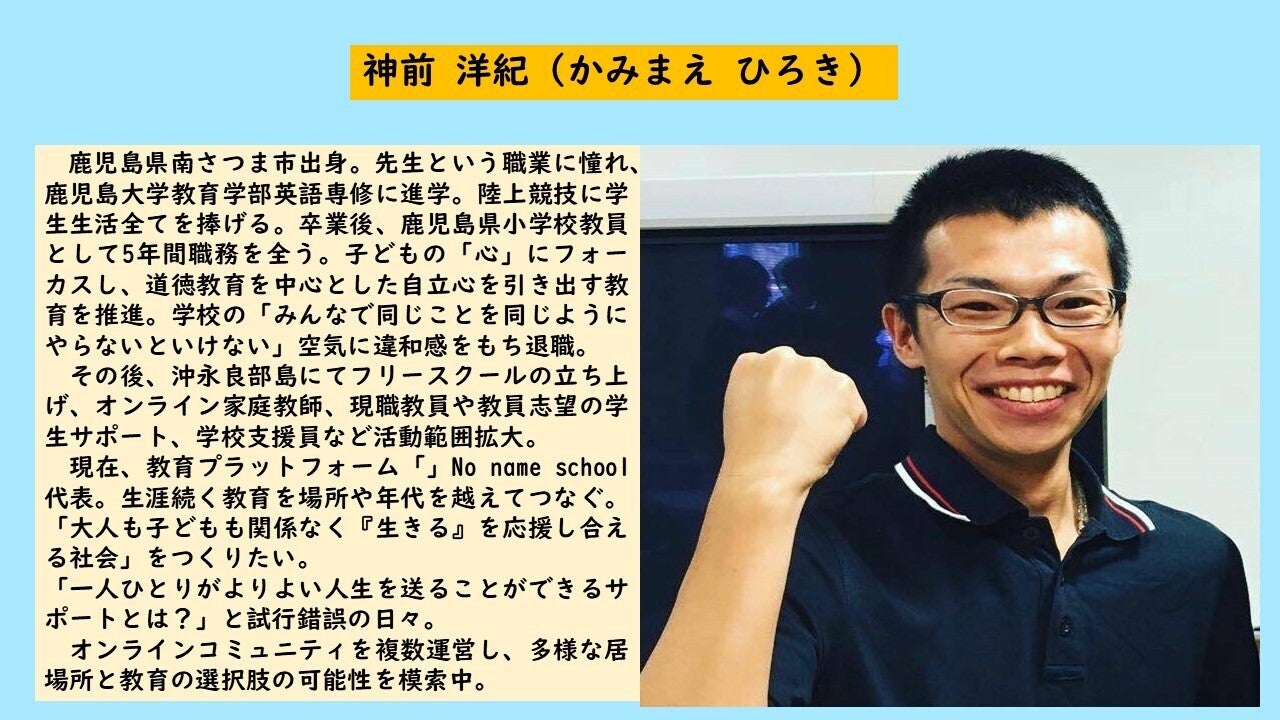本プロジェクトオーナー、教育プラットフォーム「」No name school代表、神前洋紀(かみまえひろき)と申します。