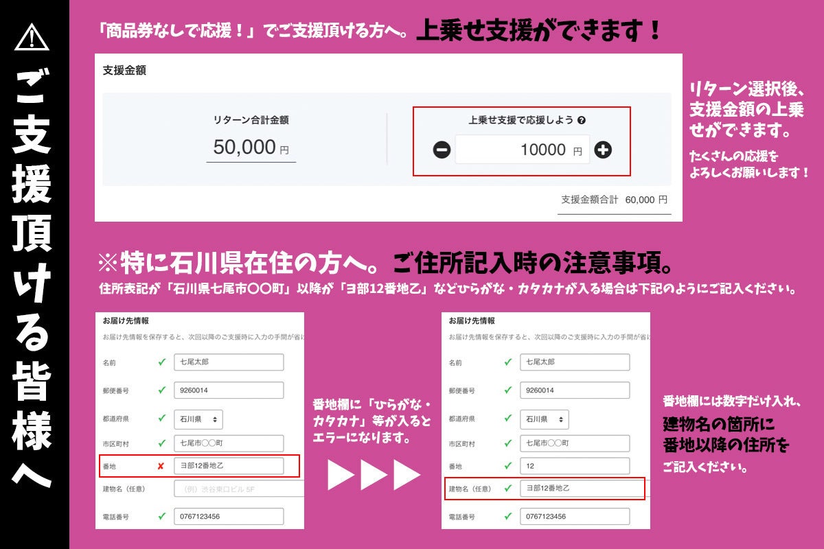 任意の金額を選び、必ず備考欄に「支援したいお店」をご記入ください。- 支援金額+10%(3,000円の支援なら3,300円分)の商品券「NANAO未来チケット」を発行します。