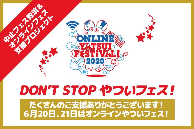 また、全国の飲食店よりフェス飯や特産品を集めた「オンラインやついフェスフードコート」、全国のライブハウスをつなぐ企画など、STAY HOME中の楽しみとして頂ければと思います!