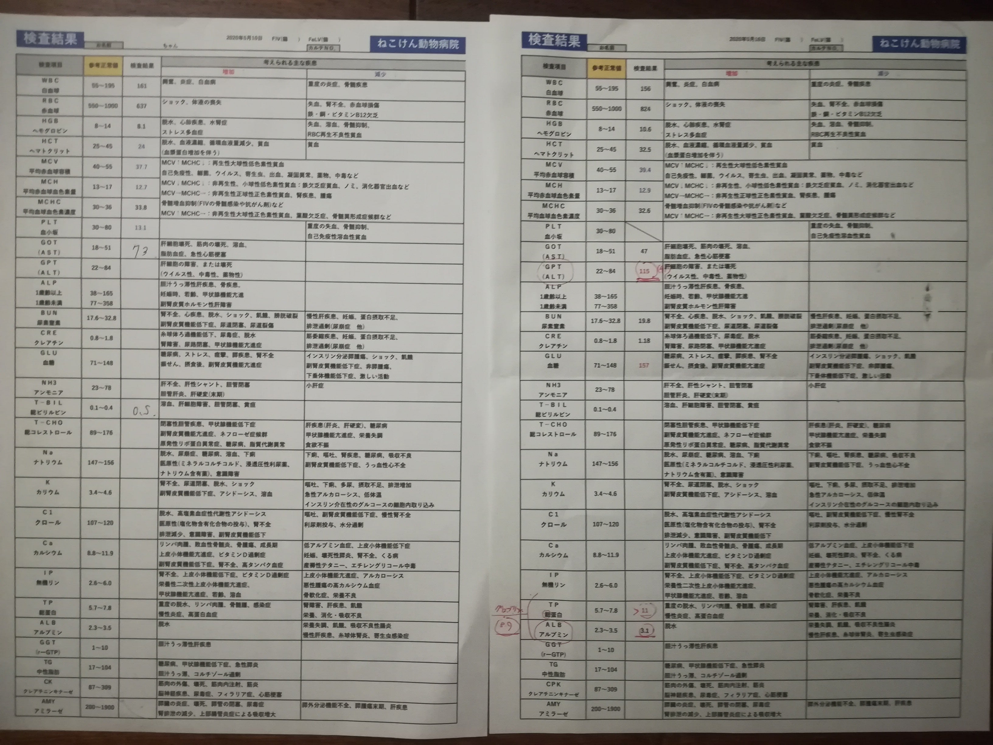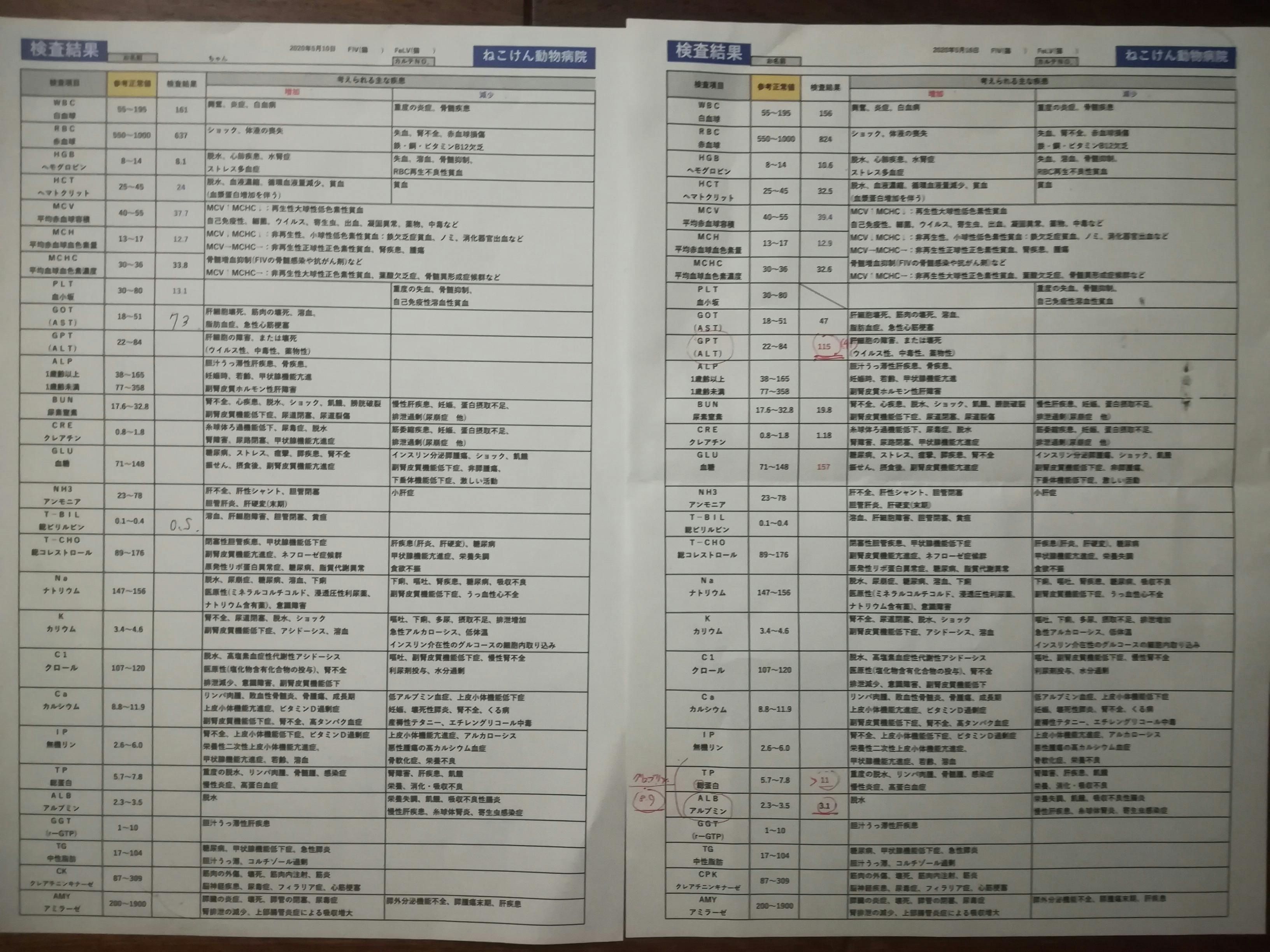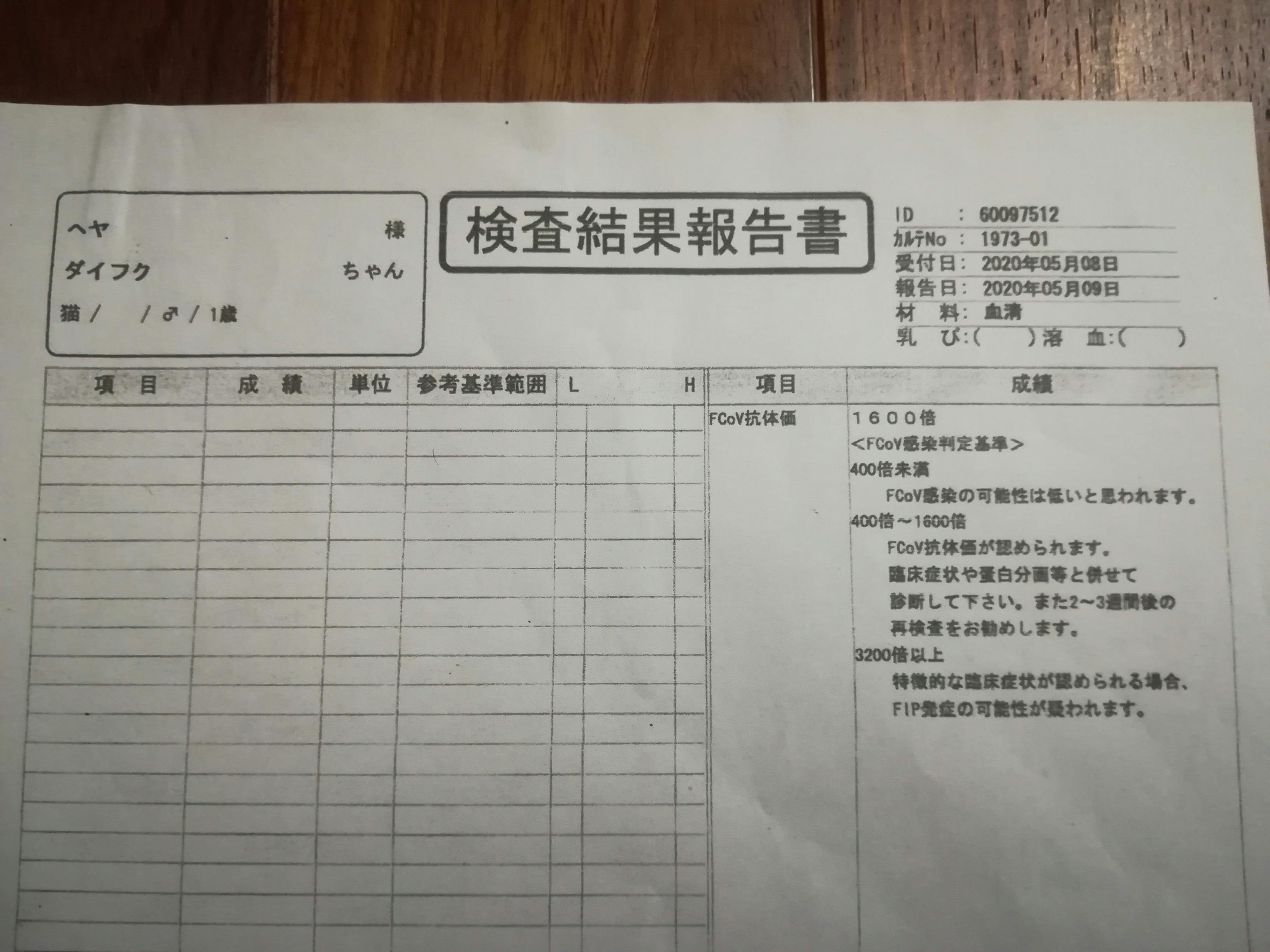 2020/11/02 18:51こんにちは。10月31日(土)4週間ぶりの通院日でした。体温:39.0℃(平熱)体重:4.09キロ(順調に増えてます(汗))血液検査:邪魔してる人がいますが ^^;↓↓A/G比は、0.65で今までの最高値が出ましたが、寛解の指標値である0.7には及ばず、やはり、まだ経過観察は続くんだな、と思いながら、先生の説明もあんまり頭に入って来ず(すみません。。。)そして、次の予約は・・・と口にした後、突然、「寛解と言っていいでしょう!」とのお言葉をいただき、一瞬、事態が飲み込めず@@先生のお話を要約すると、大福の総蛋白の数値が高いのは、FIPの影響ではないと思われる。可能性としては目か口腔が原因かと。(歯肉炎気味です。)しかし、今、特に目に見える問題がない中では様子見で良いでしょう、とのことでした。8月1日にFIP治療薬<MUTIAN>の投薬が終了し、この日は丁度経過観察90日経った日でした。90日間経過を観察して、この数値が大福にとってはベストなのだろうと言う事で、「寛解」となりました。引き続き、サプリは飲み続けることにしましたが、後は、特別に何か問題がない限りは、通院は不要となりました。この半年間、大福に関わって下さった全ての方々に感謝申し上げます。大福も頑張りました。私達夫婦も、考え方の違い、主人の体調の問題、仕事との両立、ストレスで衝突ばかりの半年間でした。とりあえず、大福が元気になってくれたので、これでやっとスタートラインに立てた気持ちです。一つ一つ乗り越えていきたいと思います。本当に有り難うございました。 もっと見る活動報告⑲ 通院記録(FIP寛解指標値に関し重要情報あり)
