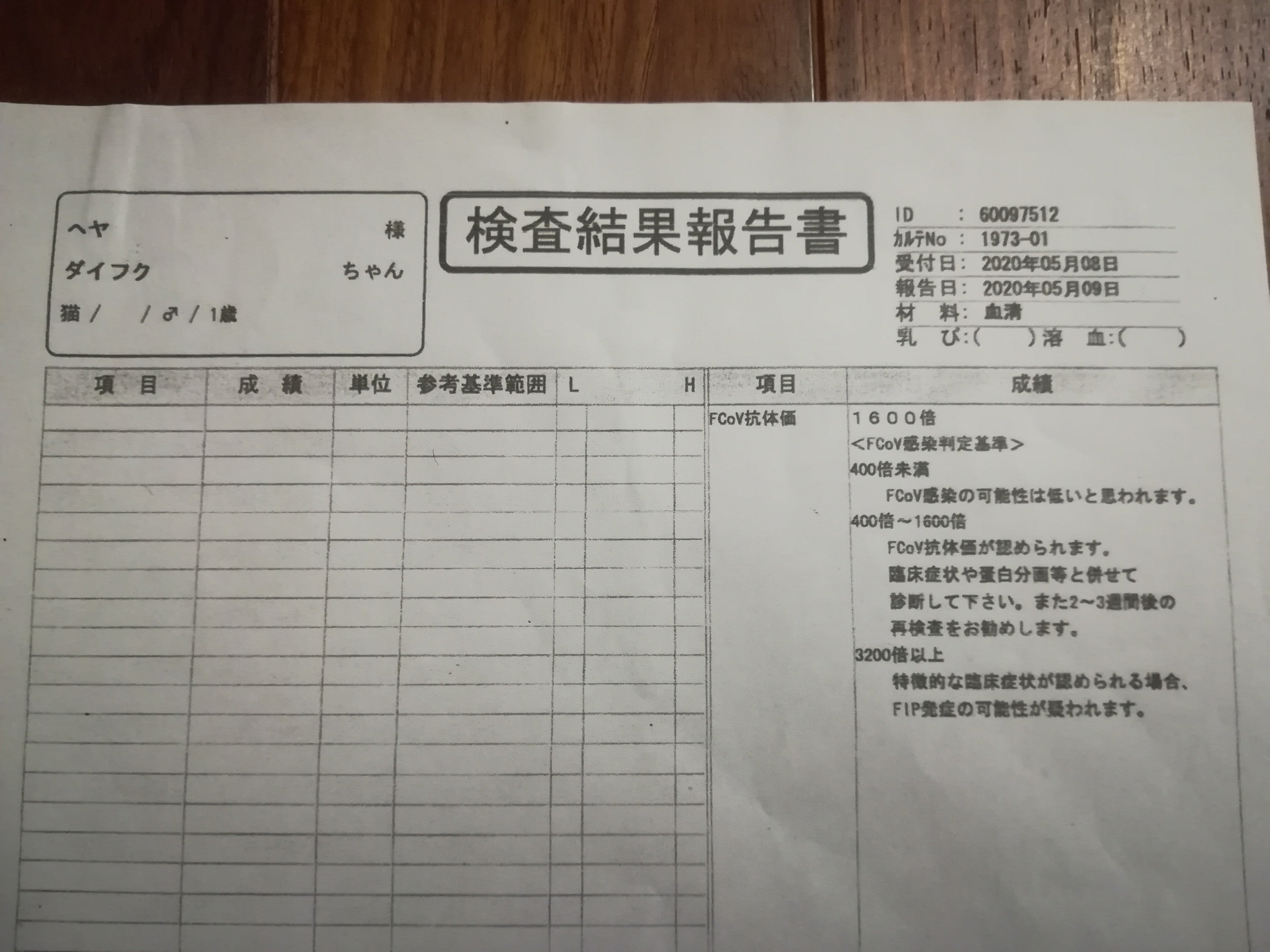 2020/11/02 18:51こんにちは。10月31日(土)4週間ぶりの通院日でした。体温:39.0℃(平熱)体重:4.09キロ(順調に増えてます(汗))血液検査:邪魔してる人がいますが ^^;↓↓A/G比は、0.65で今までの最高値が出ましたが、寛解の指標値である0.7には及ばず、やはり、まだ経過観察は続くんだな、と思いながら、先生の説明もあんまり頭に入って来ず(すみません。。。)そして、次の予約は・・・と口にした後、突然、「寛解と言っていいでしょう!」とのお言葉をいただき、一瞬、事態が飲み込めず@@先生のお話を要約すると、大福の総蛋白の数値が高いのは、FIPの影響ではないと思われる。可能性としては目か口腔が原因かと。(歯肉炎気味です。)しかし、今、特に目に見える問題がない中では様子見で良いでしょう、とのことでした。8月1日にFIP治療薬<MUTIAN>の投薬が終了し、この日は丁度経過観察90日経った日でした。90日間経過を観察して、この数値が大福にとってはベストなのだろうと言う事で、「寛解」となりました。引き続き、サプリは飲み続けることにしましたが、後は、特別に何か問題がない限りは、通院は不要となりました。この半年間、大福に関わって下さった全ての方々に感謝申し上げます。大福も頑張りました。私達夫婦も、考え方の違い、主人の体調の問題、仕事との両立、ストレスで衝突ばかりの半年間でした。とりあえず、大福が元気になってくれたので、これでやっとスタートラインに立てた気持ちです。一つ一つ乗り越えていきたいと思います。本当に有り難うございました。 もっと見る活動報告⑲ 通院記録(FIP寛解指標値に関し重要情報あり)