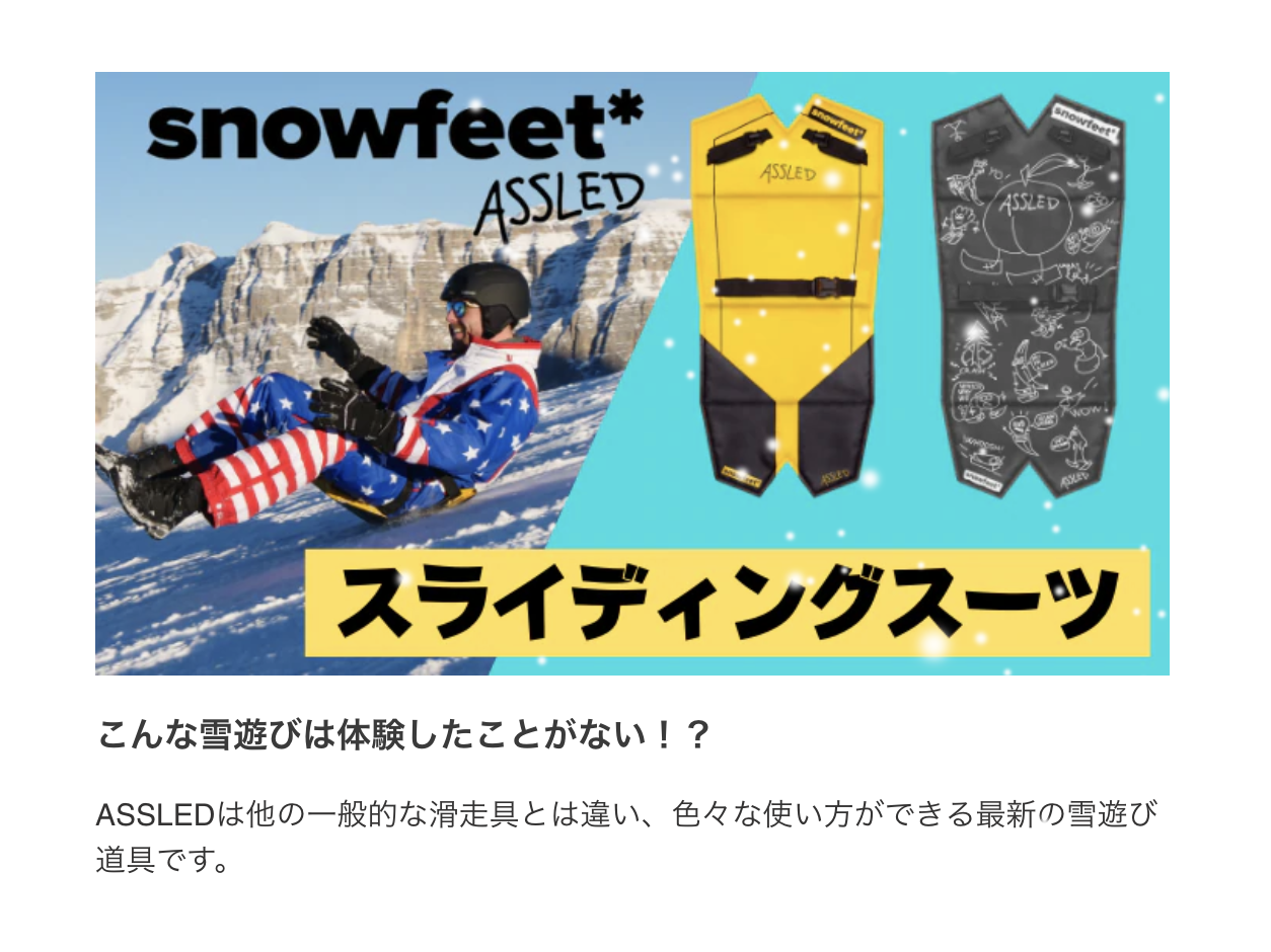 2022/04/08 18:00おそらくですが、、世界で最も自由で楽しくて、滑るだけで思わず笑顔が溢れる滑走器具を開発してしまいました(笑)snowfeetやskiskatesをすでにお持ちの方もそうでない方も、来シーズンはASSLED(アスレッド)で雪山を最高に楽しみましょう!PS. 公開予定時間が決まりました!開始予定日時: 4月11日18:00~公開お楽しみに! もっと見る
