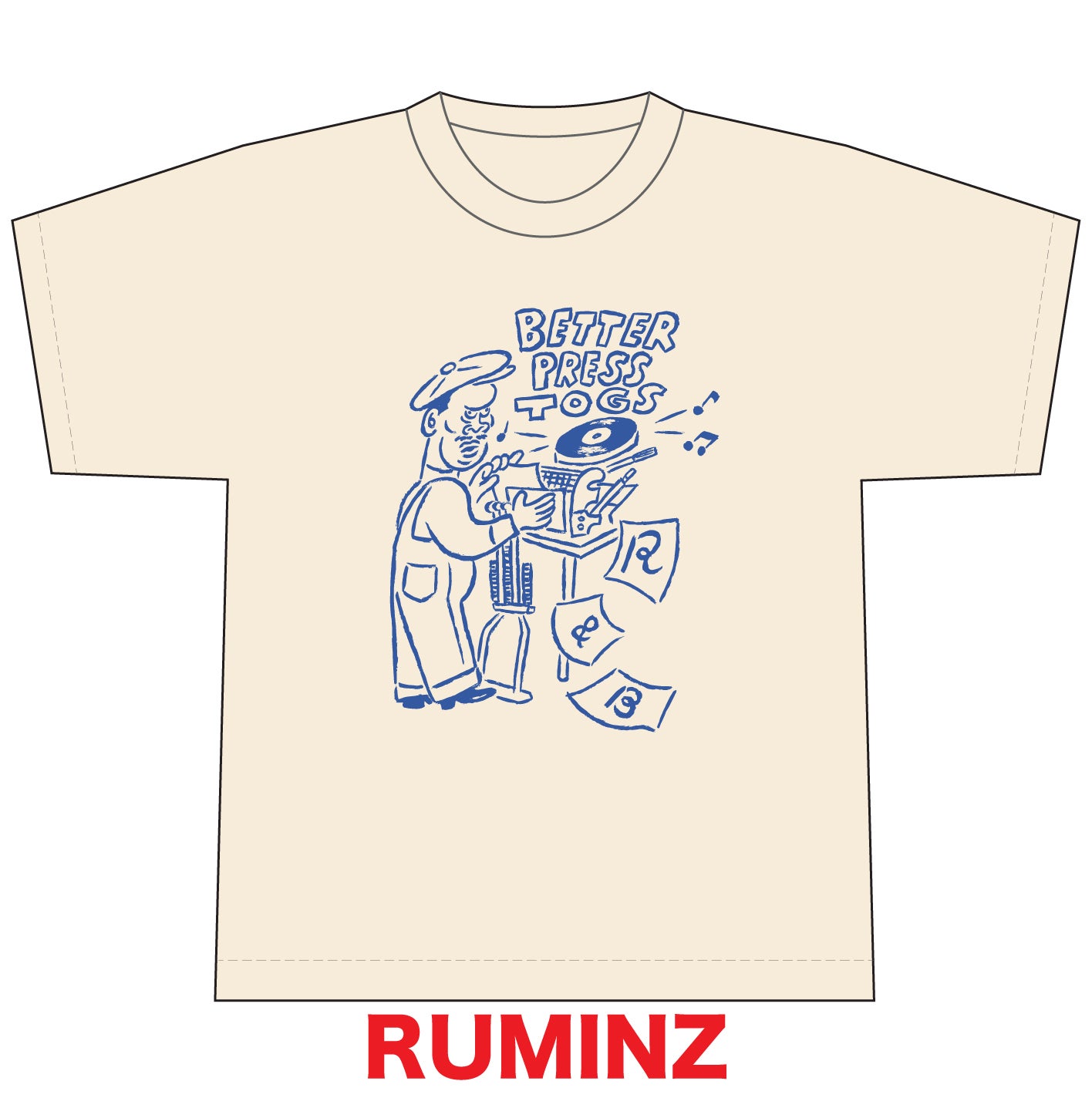 レコードやCDジャケットなど、たくさんのお仕事を手掛けられているデザイナーさんです(https://www.instagram.com/ruminz_/?hl=ja)。デザインの中の"TOGS"というのは「服」という意味で、1940~50年代くらいの古着のタグによく書いてある言葉だそうです。そのころの年代の小さなレタープレス機を描いていただきました。印刷と音楽の愛の詰まったデザインが素晴らしいです。(生成りのボディにブルーのプリントになります。)