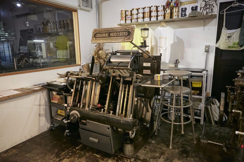 日中は活版印刷所として、ハイデルベルグ社の「プラテン」という印刷機械をメインに使って仕事をしています。ハイデルベルグ社はドイツの老舗印刷機メーカーで、印刷業界では有名な会社です。
