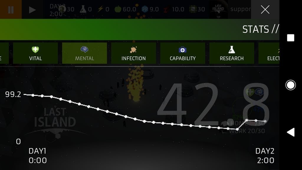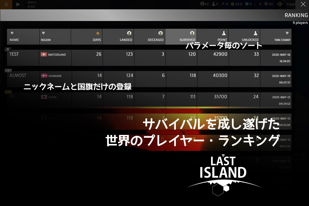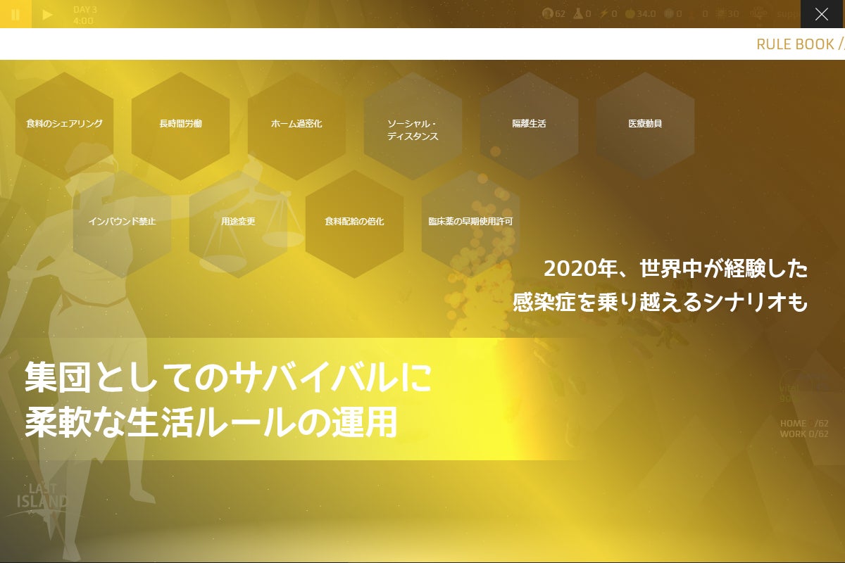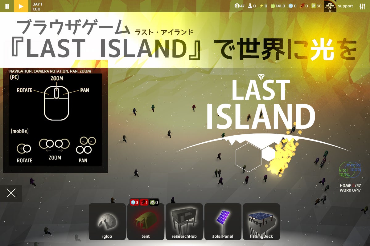 2020/06/18 08:29間もなく、チャプター1の公開が近づいていますが、先にゲームのプレイ方法についてご説明させていただきます。Soon to launch the Chapter 1, let me now introduce how to play this game.サポートいただいた方には、間もなく早期アクセスURLのご連絡を差し上げます。本公開時には、こちらのサイトやFacebook、Instagram等でもURLを公開致します。For who has supported on this crowd funding, I will let you know the early access URL,then after launching I will make public about the URL on Facebook, Instagram, etc.英語ユーザーの方からも反響いただいておりながら、こちらでは英語表示できずにご支援いただけなかった方も、ゲーム内に世界200ヵ国地域から利用可能な投げ銭システムも搭載しましたので、このチャプター1の改良と、チャプター2の開発を続けるため、ぜひともサポートよろしくお願い致します。English users might have had problems with using this crowd funding platform because of the language, but we still have tipping system embeded inside the game which is widely available from 200 countries and regions around the world. Please support this project Chapter1 and development of Chapter2 of LAST ISLAND.はい!でわ、ゲームプレイ方法について、、、当ゲームは、リソースマネジメントとして、資源を集めることと、それらをうまく活用することで集団サバイバルをしていきます。Ok, now let's talk about the game play...This game is about resource management, gathering resources and utilizing them for survival as a group of people.資源には種類があります。鉄やプラスチックなど建物の建築に必要な資源の収集から始まり、それによって建設した建物には電力や、労働力の割り当て、その人々には食糧も必要です。There are types of resources, starting from gathering building materials like Iron and Polypropylene, then with those gathered materials put to build buildings, they require electricity and human labor forces, who would need food, too.建物を建てるには、それを建てられる場所が必要なだけでなく、建築に時間も要しますし、人々が働ける時間も決まっています。何から先に建てるかや、どのリサーチから先に進めるか、または場面毎での人員配置などの工夫を求められます。To build buildings, you need space and not only that, you need time let it be built.People can work only limited hours. Which buildings to prioritize, which research to conduct first, or how to allocate people to what, it all requires your ingenuity.人々には物理的な体力としてのバイタルと、心理的な活力としてのメンタルがあり、働く場所がないことで集団サバイバルへの貢献をしていなかったり、夜に眠って回復するための家がなかったりするとメンタルがさがってしまいます。People have physical vitality and psychological mental resources.If without workplaces, people will have negative effect on their mental state because of not contributing to the group survival, or without home to sleep at night is also another factor to lose mental resources.また、水面の潮位は常に変わるため、水没すると機能しなくなる建物もあり、人々は泳ぐこともできますが、当然バイタルとメンタルがより多く奪われます。By the way, water level has tide which fluctuates all the time, so some buildings stop working. People can swim on water, but it sucks vital and mental resources quicker than when they are on the ground.メンタルの状態は、労働効率を下げることにもなったりします。1日1回の食事をちゃんと摂れるだけ食糧を確保していることで、バイタルもメンタルも回復させられます。Mental state affect labor efficiency.Securing enough food for the day for everyone, their vital and mental can be recovered.バイタルとメンタルの両方が下がりきった状態が続くと死者すら出てしまいます。サバイバルであることを忘れず、常にぎりぎりの状態でも、常に先を読み、工夫をしましょう。If both of vital and mental state kept at the lowest level, it leads to a mortal fate.You have to be reminded that it is a survival, then you have to develop smarter ways to conquer challenges in devastating situations.集団サバイバルのためには資源や建物、そしてリサーチによってサイエンスを進歩させることがゲームの大きな目的。時には、人々に課す新しい生活様式を設定して、難局を乗り切ることも大切です。For survival as a group of people, the big subject in this game is to advance the science by resources, buildings and researches. From time to time you also need to set a new norm of living upon your people to overcome difficult situation.チャレンジこそがゲームの醍醐味ですので、決して簡単にクリアできないかもしれませんが、何度もチャレンジすることでコツをつかめるでしょう。しかし、わかったと思ったら、またさらに難局に直面し、思っていたより長期視野で戦略を立てていないと先へ進めなかったりします。持てるリソースマネジメント能力を存分に発揮してぜひあなたもこのチャプター1のクリアを楽しんで下さい。Challenge is the core of the game, definitely uncompromising, but while you play again and again with different style, you will build your own strategies. Then at a certain point you might feel "I know now", but another challenge might let you think you still need to plan out in long term scope. Use your full capability of resource management 