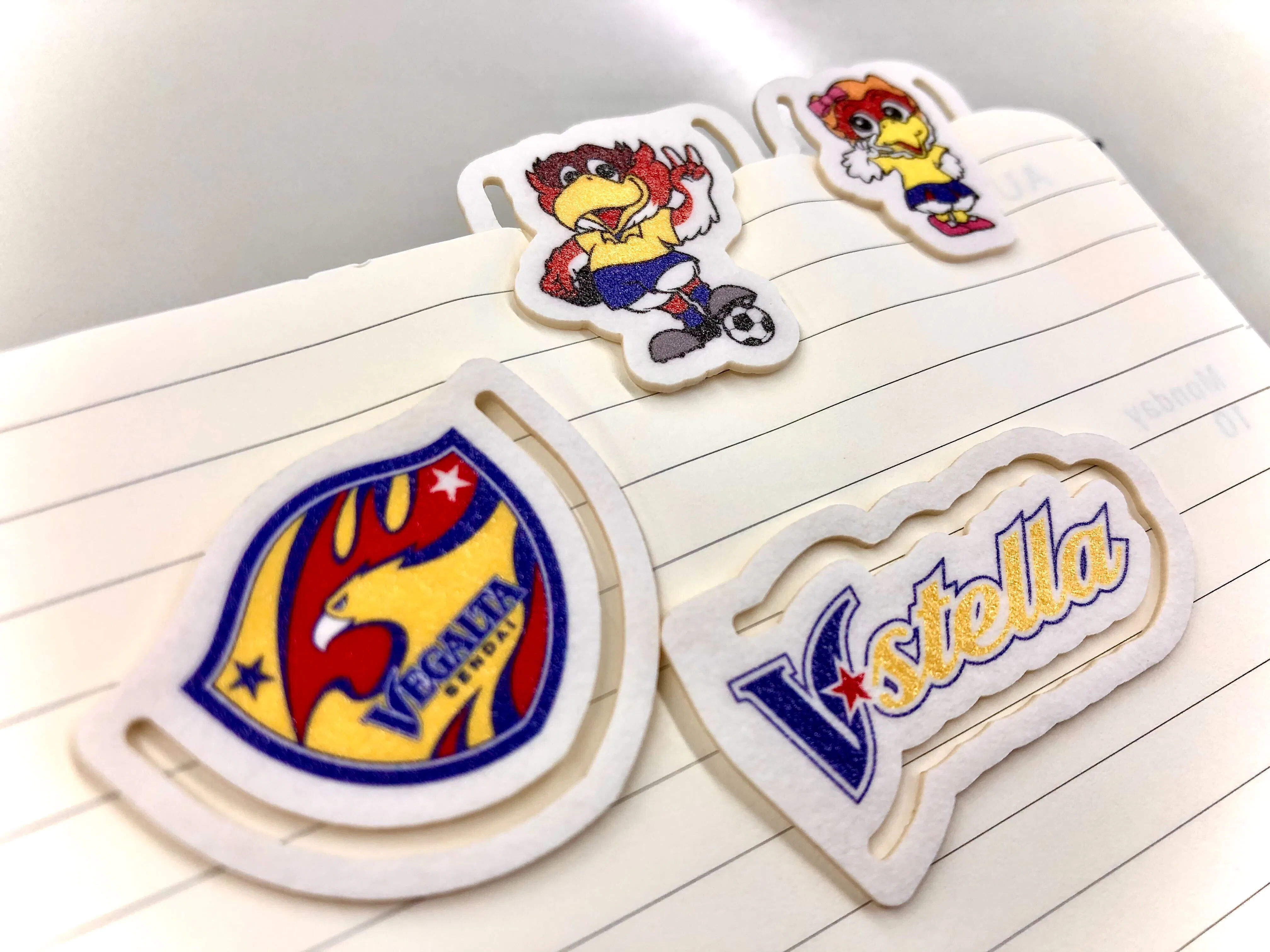 仙台七夕まつりで実際に使われ、さまざまな願いが込められた"仙台にしかない”特別な和紙を再利用しています。オリジナル紙クリップは、ベガルタ仙台のエンブレム、ルターナ、ベガッ太、ヴィステーラロゴの4種類1セットでお届けいたします。