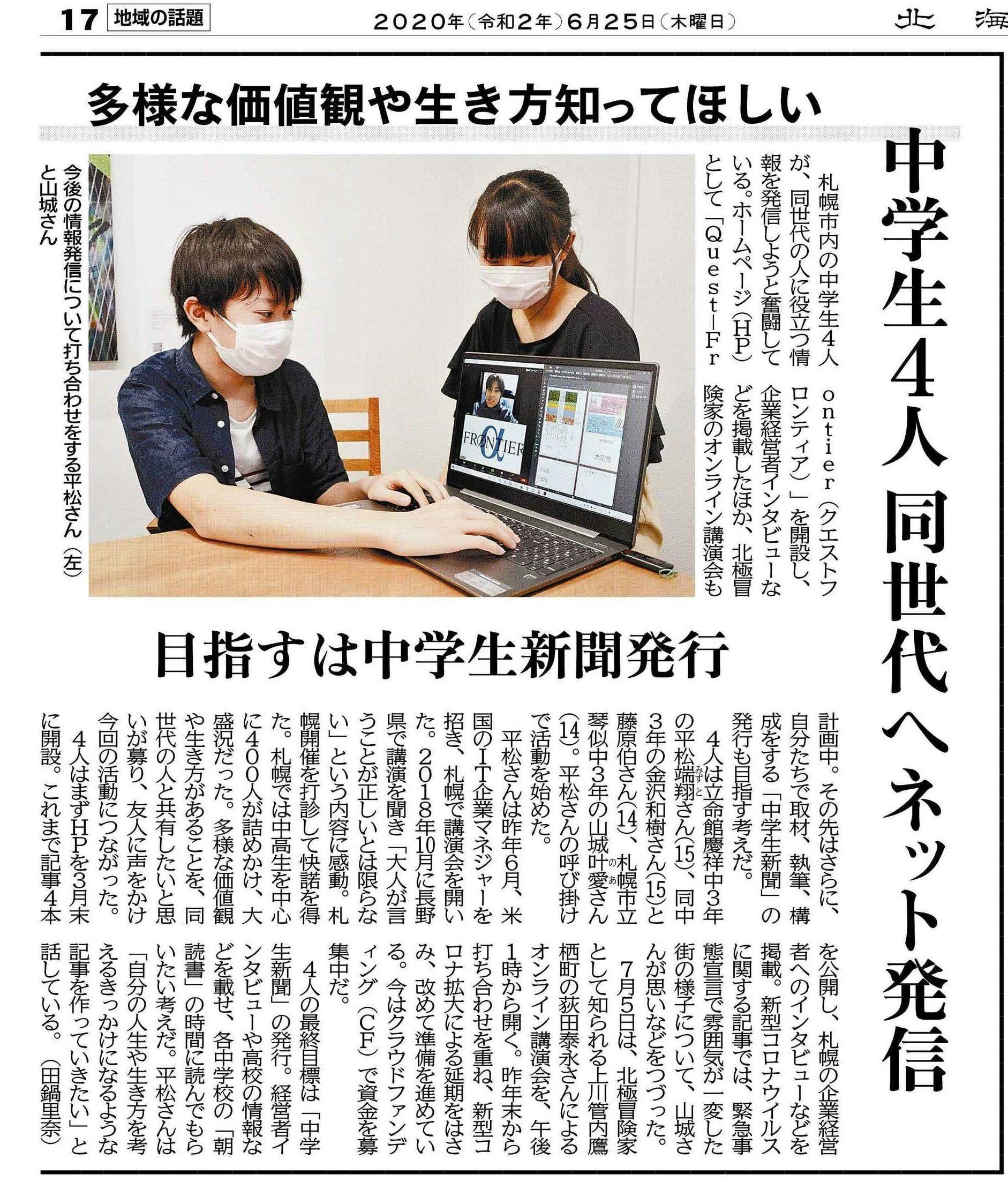 2020年2月 小中高校生向けに様々な方の生き方や考え方を取材し、記事にして掲載することを目的としたウェブメディア「Quest-Frontier」公開
