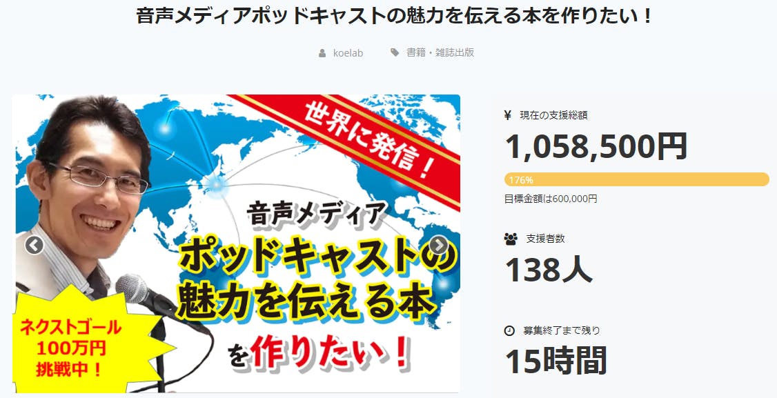 クラウドファンディングを通じて本の出版と同時に、たくさんの方にポッドキャストを知ってもらい、ポッドキャストのファンになってもらいたいです。