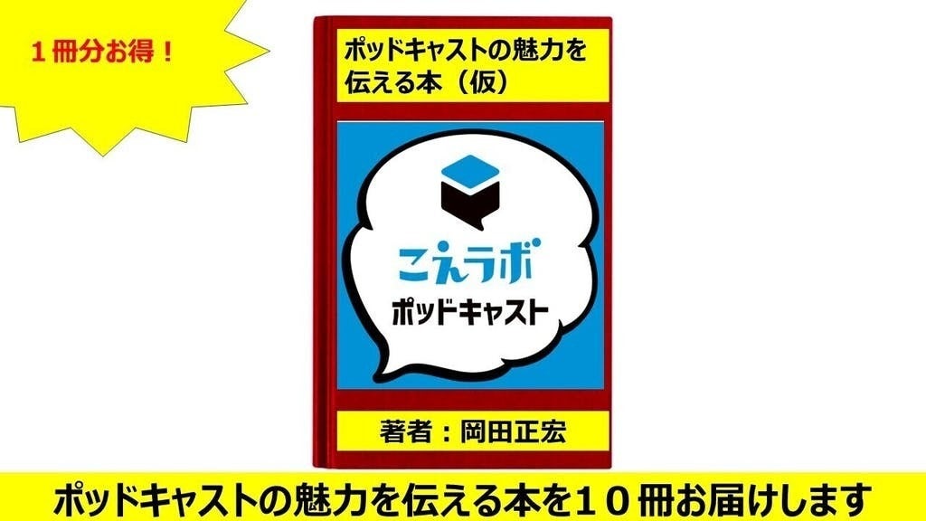 特に支援が多かったのが、ご自身のポッドキャスト番組を書籍に掲載するリターン品で残り2名となりました。書籍に番組が掲載されたら、周りの方にもご案内したいかなと思いまして、1冊お得となる10冊セットをご用意いたしました!