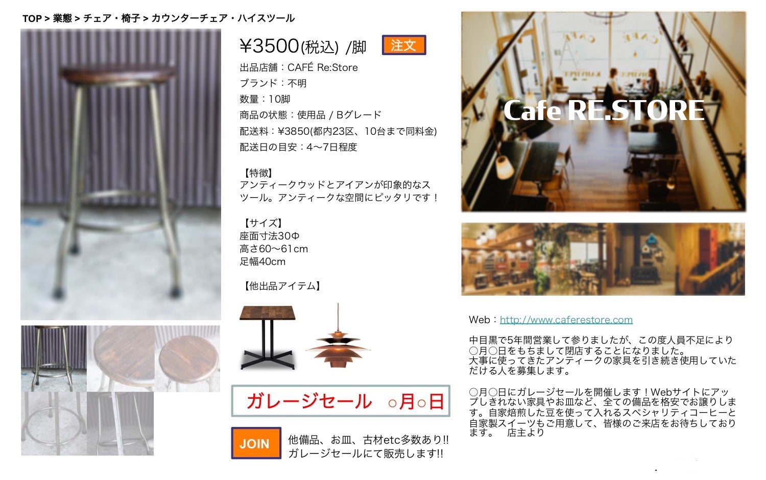 店舗で使用されていた家具や照明をこのサイトで循環させることで、泣く泣く閉店するお店のオーナーさんを皆さんの手で少しでも救う一つの手立てになりたい。