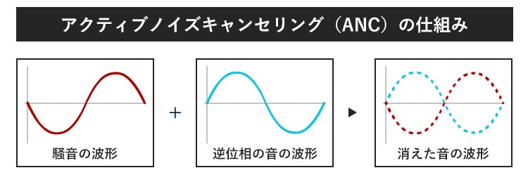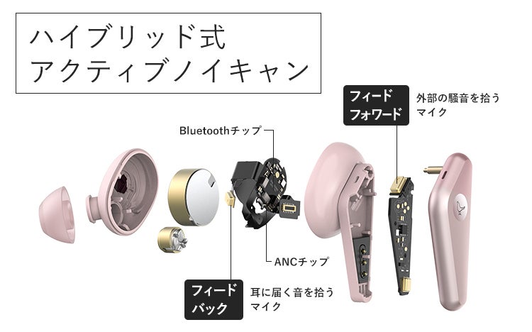 騒音感知用のマイクの位置により、フィードバック式、フィードフォワード式の2種類に分けられるANCですが、「TRACK Air+SE」には、両方を合わせた、ハイブリッド式を採用。外部のノイズと、耳の近くのノイズ、両方を感知し、逆位相の音波で打ち消すことで、よりノイキャン効果を高めています。