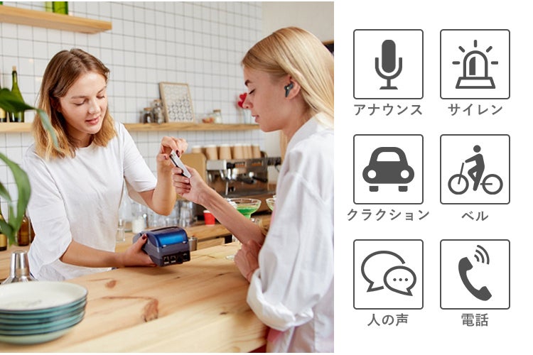 外音取り込みモードは、音楽を聴きながら一時的に環境音を取り込みたいシーンに最適。例えば、レジでの会計時、電車のアナウンスを聞きたい時、話しかけられた時などに、大活躍!再生中の音楽のボリュームは、一時的に下がります。