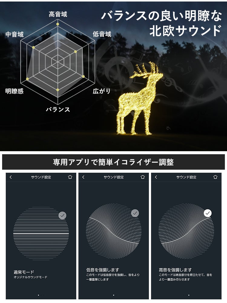 さらに、専用アプリからイコライザー調整も可能です。通常モード(オリジナルサウンドモード)・低音強調モード・高音強調モードの3タイプから選ぶだけのシンプル操作なので初心者の方でも簡単に調整頂けます。
