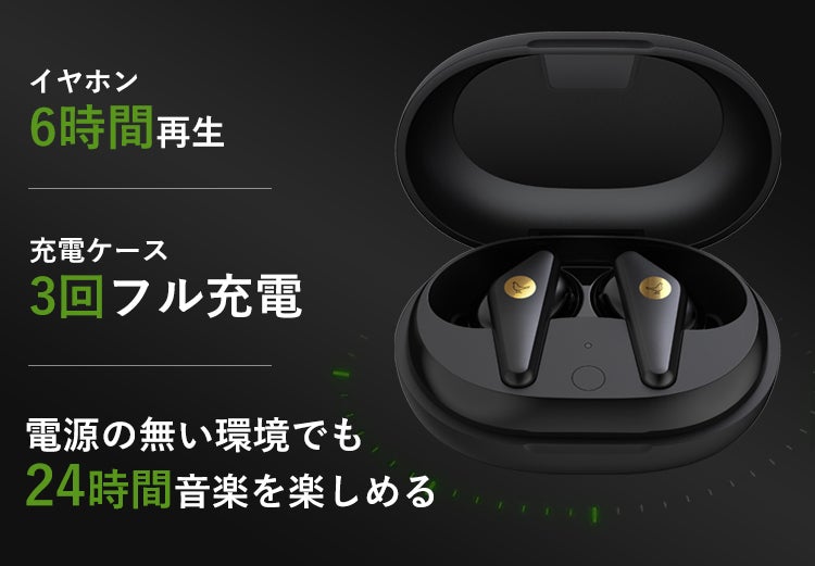 1度の充電で約6時間の連続再生が可能。さらに充電ケースでは、フル充電時、イヤホンを3回充電出来るので、合計で24時間、モバイルバッテリーや電源の無い環境でも音楽を楽しんで頂けます。