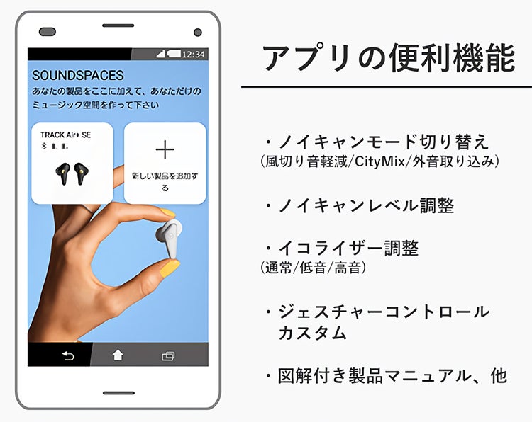 ノイキャンモードの切り替え、ノイキャンレベル調整、イコライザー調整、ジェスチャーコントロールカスタムなどの各種設定、他、分かりやすい図解付き製品マニュアルもアプリからご覧いただけます。