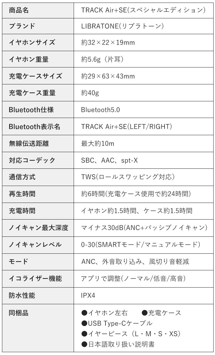 A:昨年発表された、LIBRATONE社製完全ワイヤレスイヤホン「TRACK Air+」のスペシャルエディション版です。「TRACK Air+」 は、TWSのトレンド機能を満載したハイスペック仕様で、販売シェアトップを占める、国内外の有名ブランド2製品に並ぶ完全ワイヤレスイヤホンとして、海外メディアや動画サイトで大きな話題となりました。「TRACK Air+ SE」は、その優れたスペックを引き継ぎ、さらに、限定カラー仕様、SE限定の風切り音軽減モード、トリプルマイクを搭載しております。