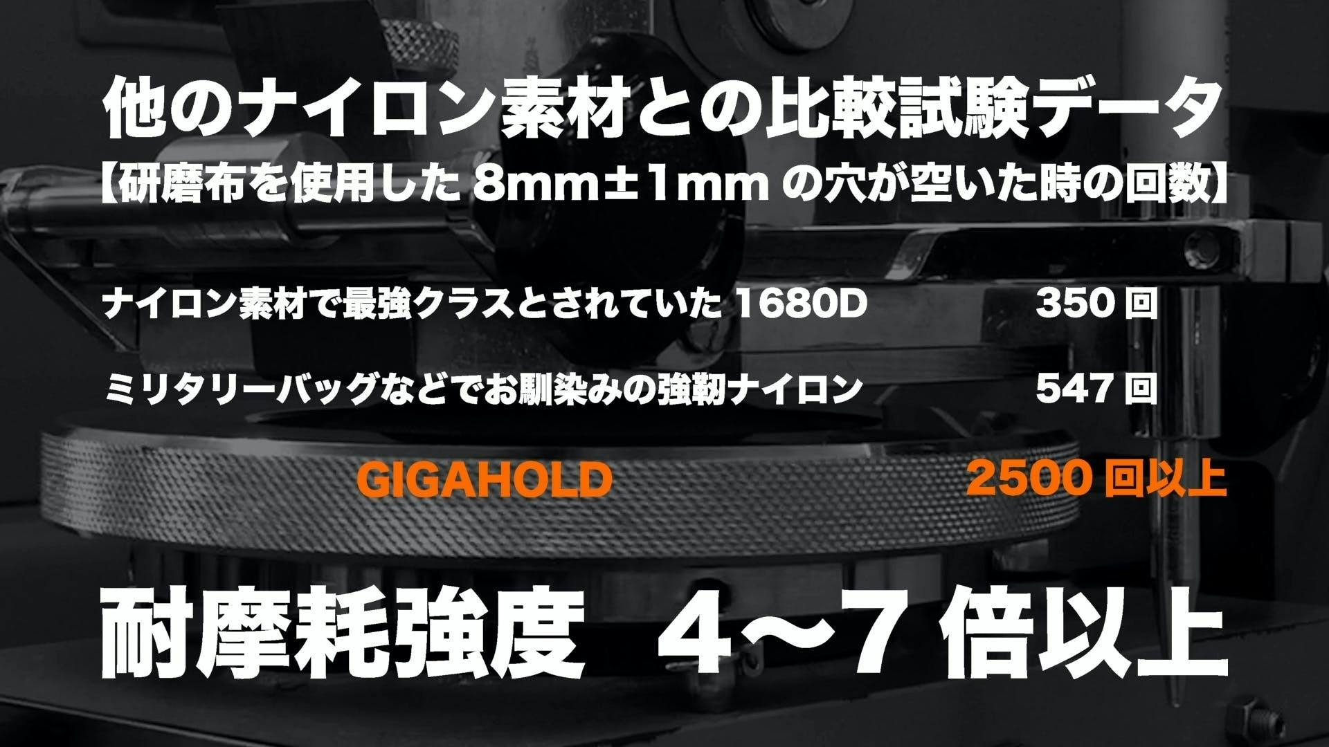 4200D(デニール)クラス強靭ナイロン「GIGAHOLD」を使用しました。丈夫なミリタリーバッグにも使用される1680Dクラスナイロン素材の、さらに2倍以上の極太糸を使用し、耐摩耗強度は4〜7倍以上と抜群の耐久性です!過酷な環境下においても快適に長くご使用いただけます。