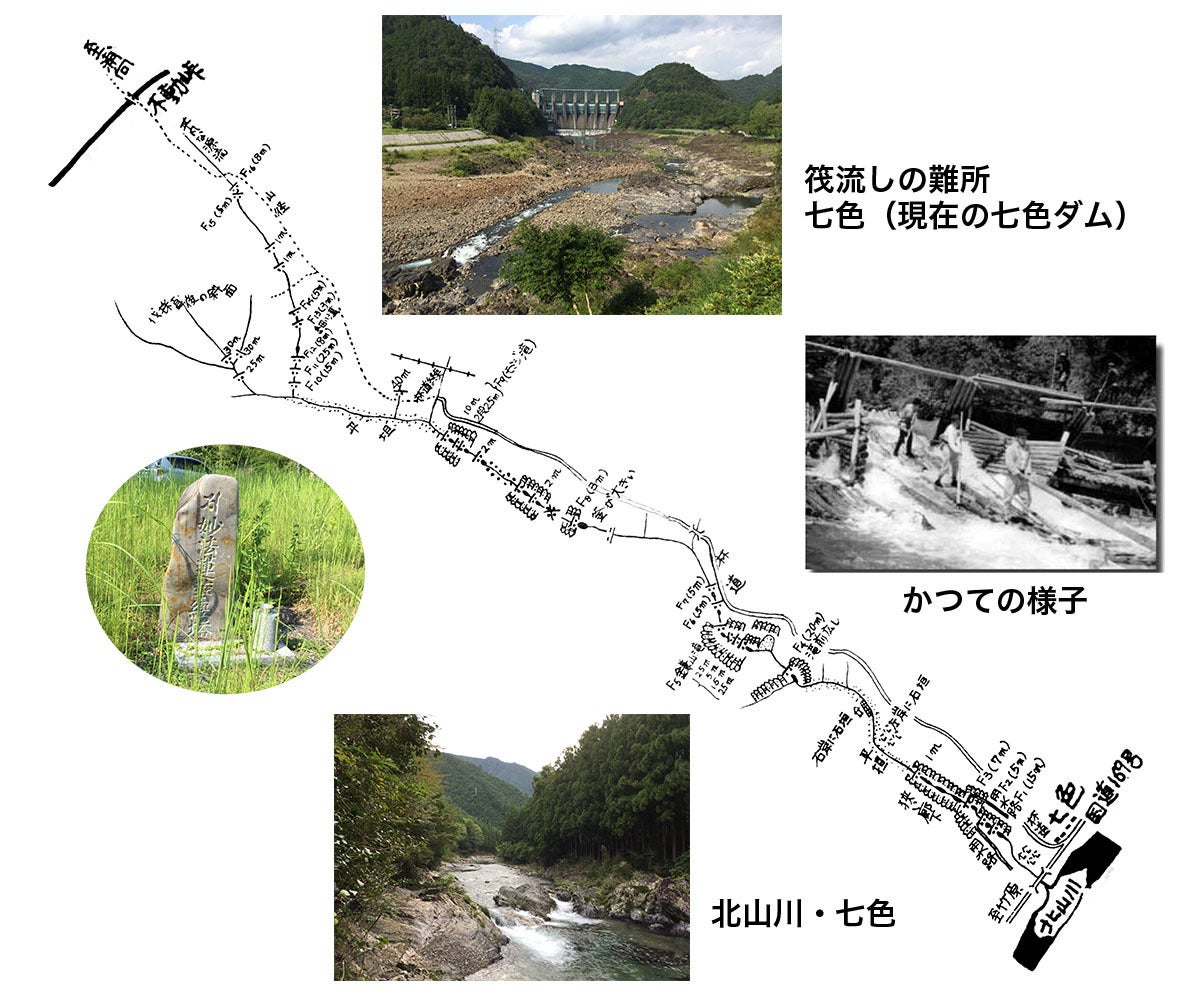 上北山村の西原や小橡の材木は河合で筏に組んで池原へ、備後や大瀬からも池原へ、水量の少ない西の川筋では堰を築いて水量を調整して大川へ、そしてもっとも難所である「七色の滝」を命ながらに乗り落として北山村七色の「筏繋ぎ場」に辿り着きます。材木を運び終えた筏師は、すぐさま山道を歩いて家路へと急ぎますが険しい「不動峠」を越える頃には深夜になることもあったそうです。