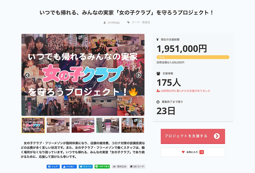 クラウドファンティングのご支援のおかげで、営業できず仕事が無くなっていたスタッフたちに仕事を与えることができました!「いつでも帰れる、みんなの実家「女の子クラブ」を守ろうプロジェクト!」のプロジェクト達成率が210%(6月3日現在)なのは、驚きと感謝と皆さまとこの場所を作っている実感を、とても深く感じました。これからも、女の子クラブを維持しコミュニティの活性化に努めたいと思います。