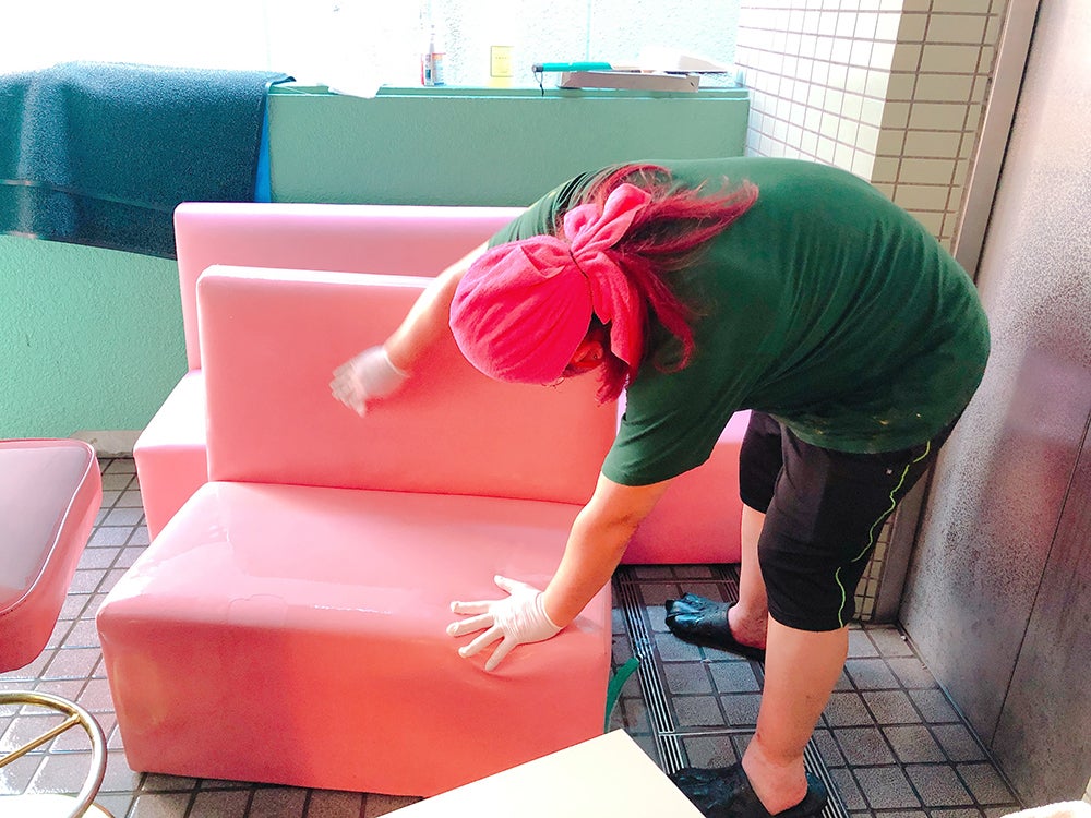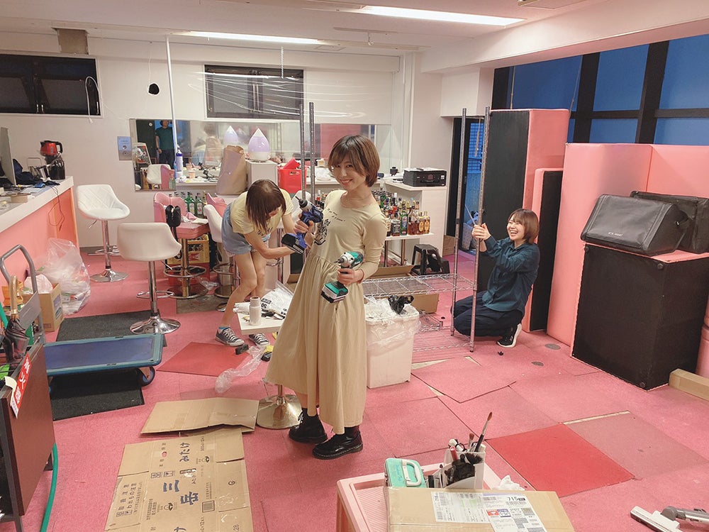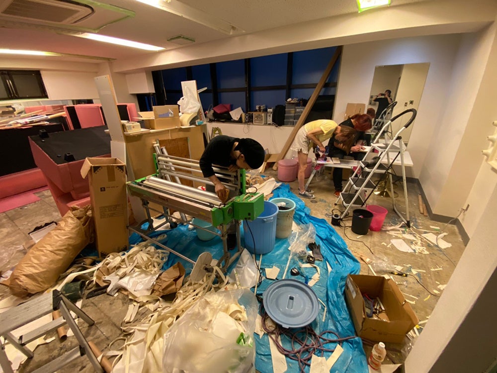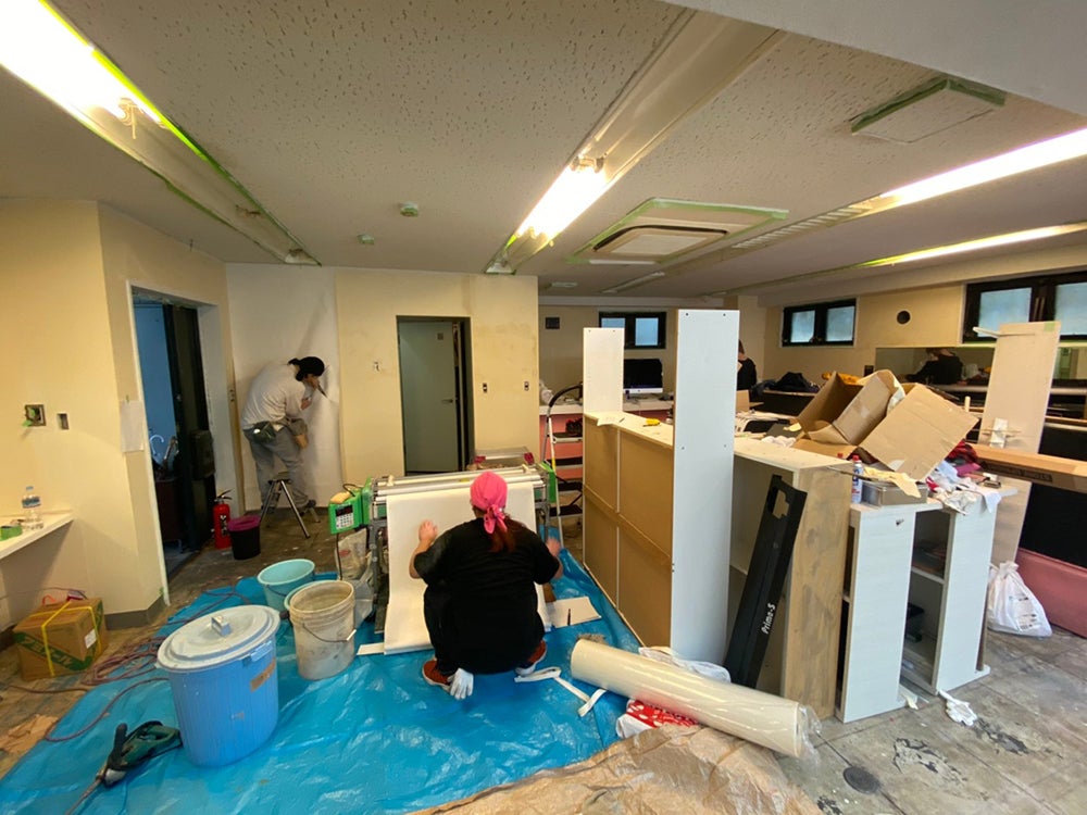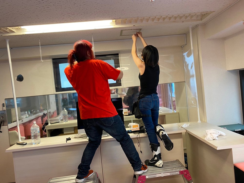 クラウドファンティングのご支援もあり、開店に向けて店内の大掃除・壁紙の張替え・天井の塗装・コロナ対策のビニールやアクリル板の設置等を行いました。作業は、すべて女の子クラブ・フリーメゾンのスタッフで行い、臨時休業中でも活動できたことを感謝いたします。