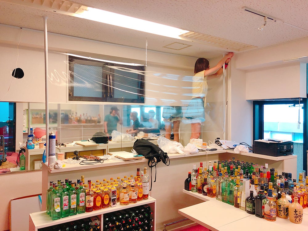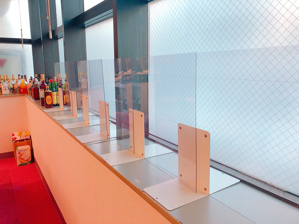 カウンターにビニールを設置し、アクリル板でカウンターの左右に仕切りを設けました。また、営業中しばらく、スタッフはフェイスガードを着用して飲み物を提供する予定です。