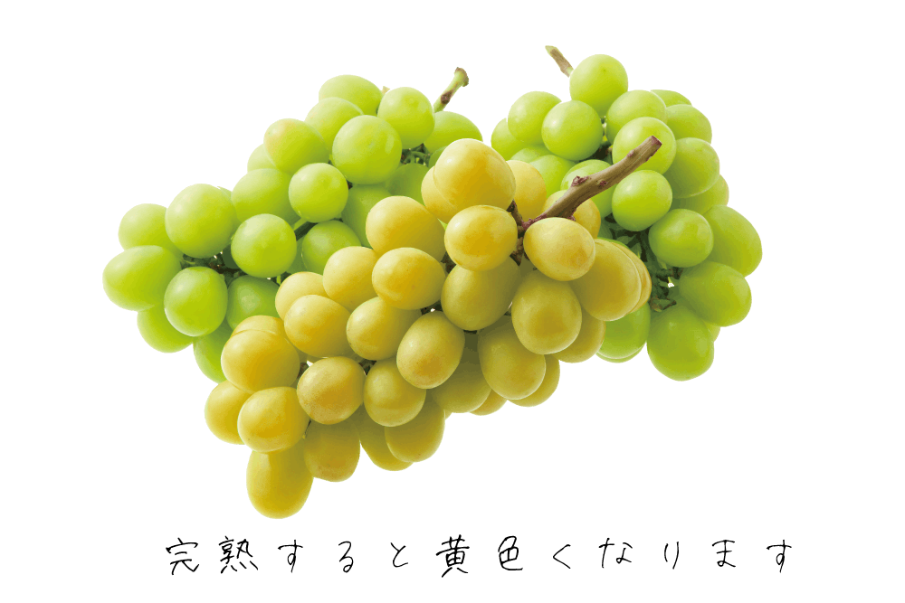 シャインマスカットは完熟すると皆さんが普段目にしている鮮やかな緑のシャインマスカットと違い、【黄色み】を帯びた落ち着いた色合いに変化します。緑のものがさっぱりとした甘さなのに対して、濃厚な甘みとなります。