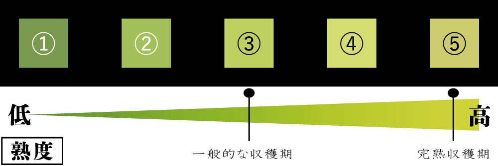 一方、⑤の色で完熟収穫されたものは糖度19度、場合によっては20度を超える甘さとなります。