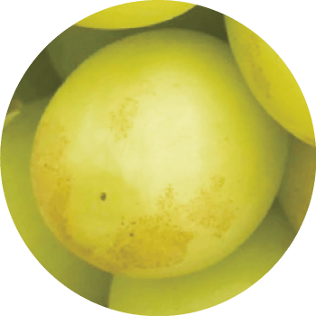 完熟したシャインマスカットは【かすり】と呼ばれるシミのようなものが発現しやすくなります。もちろんこれは病気などではなく、単純に見た目を損なうということで敬遠されてしまいます。ですから農家も③の色での収穫を目標に栽培しますし、また完熟がゆえに出荷管理も通常より難しいこともあり一般的に市場に出回らないのです。