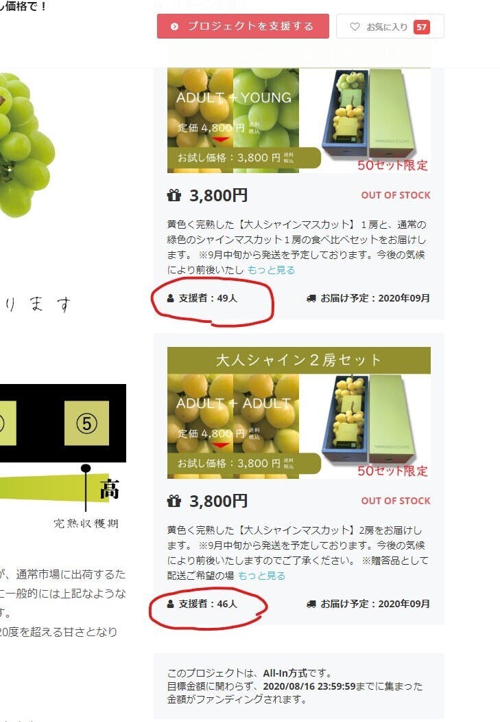 【食べ比べセット】【2房セット】ともに50セットずつご用意しておりましたが、数量が50に達していない状況で、「OUT OF STOCK」となっております。また複数のご支援をいただいているご支援者様の分なのかとも考えましたが、達成総額が目標金額に5%分達していないという摩訶不思議な状況です。この件に関しまして、現在CAMPFIRE本部に問い合わせております。