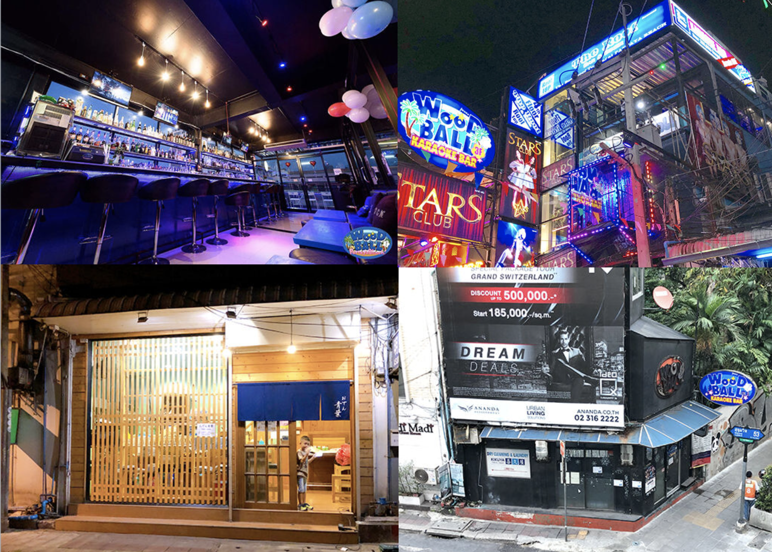 ウッドボールグループは、カラオケBAR業態のウッドボールが4店舗(1店舗はFC)、他に僕が直接経営するカクテルバー1店舗、スナックバー1店舗、居酒屋1店舗、ラーメン店1店舗、和食店1店舗になります。いずれもタイ国内に店舗があり、バンコク、パタヤ、シラチャで展開しています。