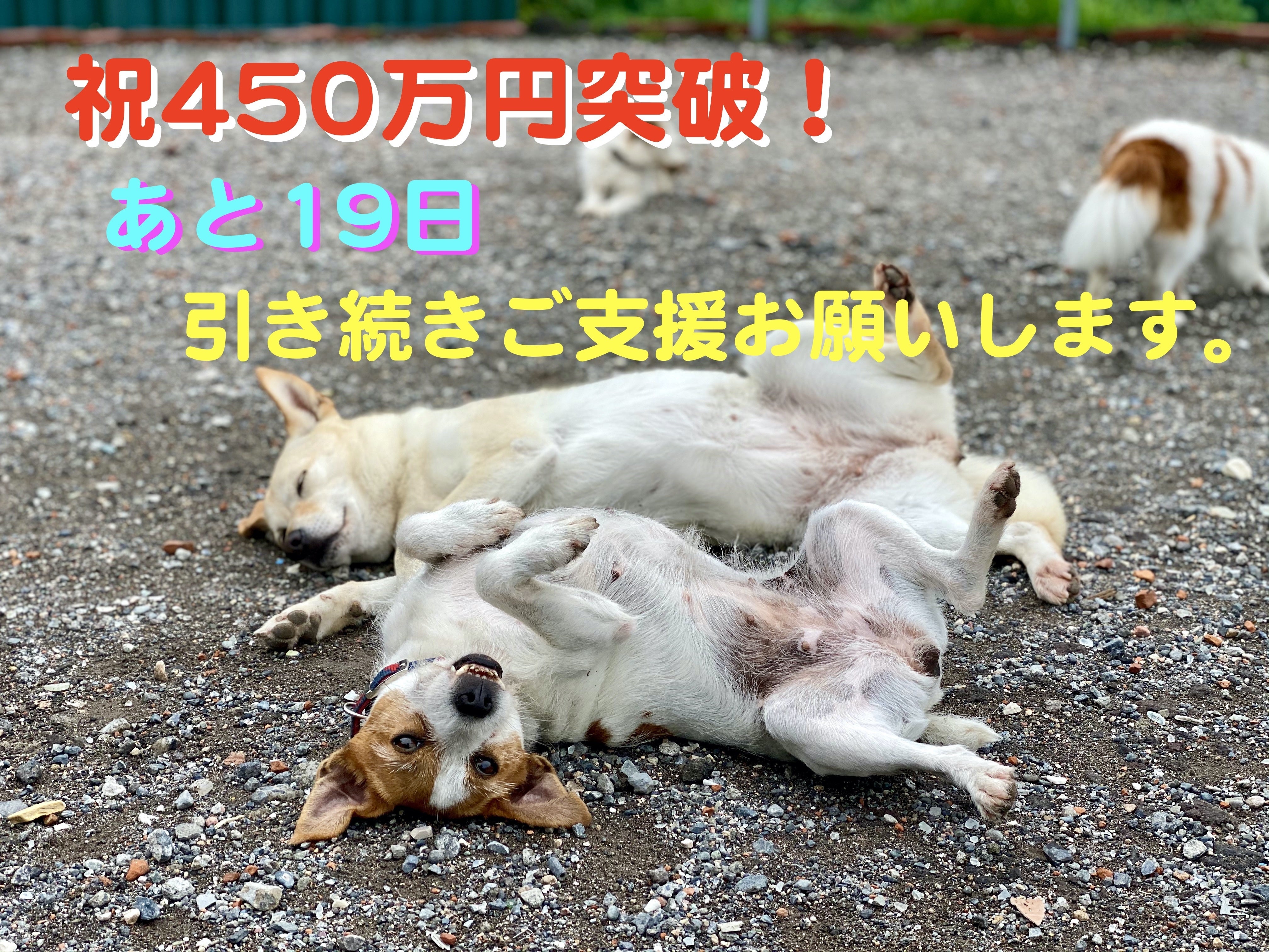 皆様からのご支援がついに450万円突破を突破しました!本当にありがとうございます。皆様からの温かいご支援のおかげで今日もわんちゃん達は元気いっぱいに過ごすことができております。また支援金額には反映されませんが情報の拡散や心温まる応援のメッセージにスタッフ一同感謝しております。クラウドファンディングも残り19日となりいよいよ第4コーナーにかかって参りました。最後まで力いっぱい頑張りたいと思います。引き続き皆様のご支援とご協力をお願いします。https://camp-fire.jp/projects/view/280603新しいリターンも追加しました。是非ご覧いただければ幸いです。
