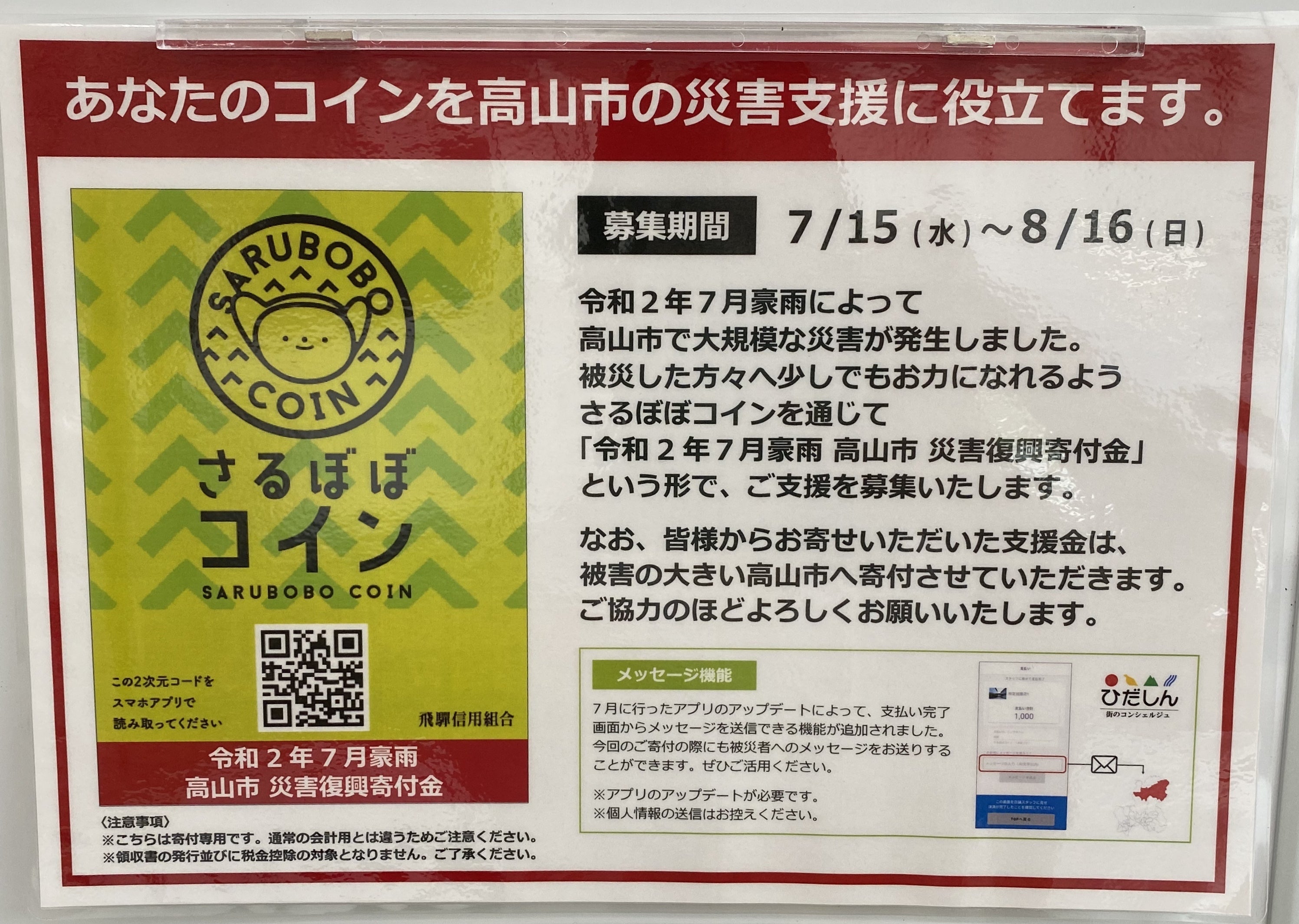 さるぼぼコインでの豪雨災害寄付も受付中です。