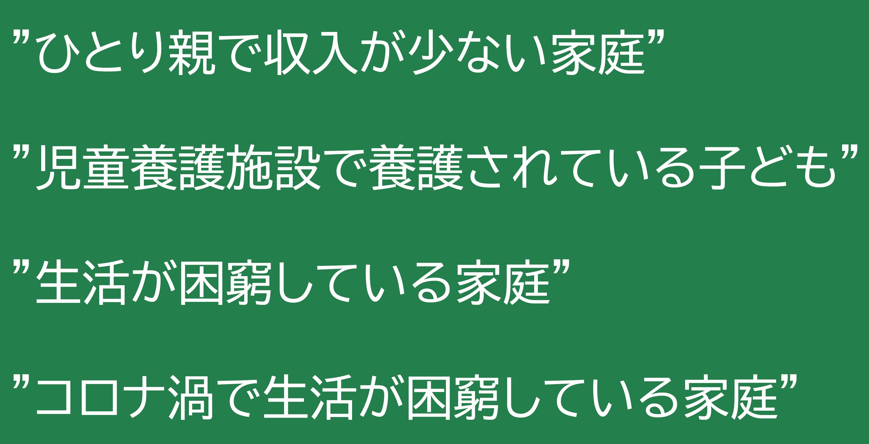 ひとり親家庭、コロナ禍で生活が困窮している家庭、色々な事情のもとご家族と会えない子ども達、私たちが想像出来ないような境遇で生活している子ども達もいます。