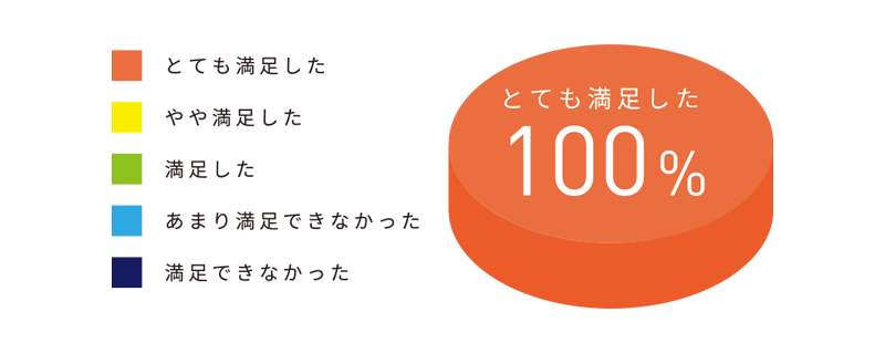 2019年7月20日、8月10日〜12日の4日間に「いいね!レモネード」に参加体験された保護者さま29名に対して「とても満足した」を5「満足できなかった」を1、とする5段階評価でアンケートをいただき保護者さまの100%が「とても満足」と回答しました。