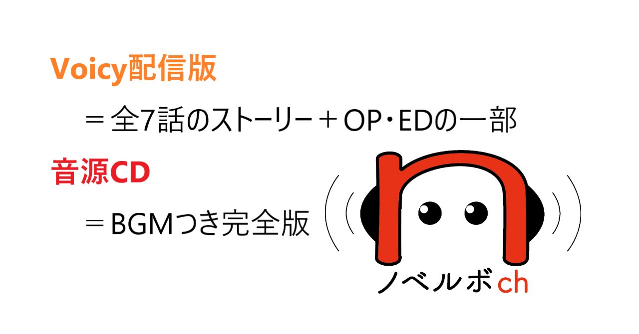 5月22日から開始したクラウドファンディングも、7月12日で終了しました。およそ1カ月半、ご支援・拡散いただきまして、本当にありがとうございます!目標額には遠く及びませんでしたが、『ノベルボch』という存在と活動を知っていただく、良い機会になったとメンバー一同感じております。■今後の予定これからは8月上旬の本編配信に向けて、制作も本格的になっていきます。本編制作の過程は、Voicyの『ノベルボch』にて制作メンバーがMCとして引き続き配信してまいります。ぜひ、チャンネル登録くださいませ。■今後のリターン品対応の流れ8月から順次対応となります。歌詞カードへのクレジットおよび音源CD配布については、本編配信終了後からの順次対応いたします。スキルアップ関連については、後日、担当者より個別にご連絡いたします。実施日程の調整等については、各担当者とご相談ください。ご不明点等がございましたら、下記ノベルボchのメールアドレスまたは公式TwitterのDMまでお願いいたします。ノベルボch製作委員会:novelvo.ch.info@gmail.comノベルボch公式Twitter:@NovelVo_ch