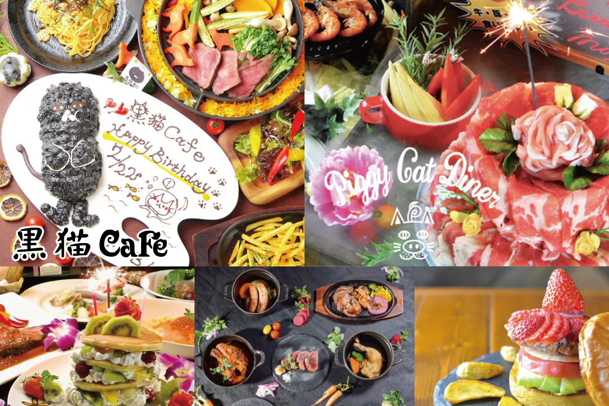 黒猫カフェでは、猫型エクレア「ねこれあ」や、マスコットキャラクターねこれあ型ケーキ付のコースなどをご注文いただけます。