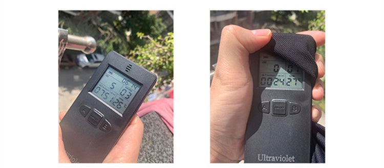 袖口のマーク普段は白色で、紫外線を感知すると、色の表示が変わります。