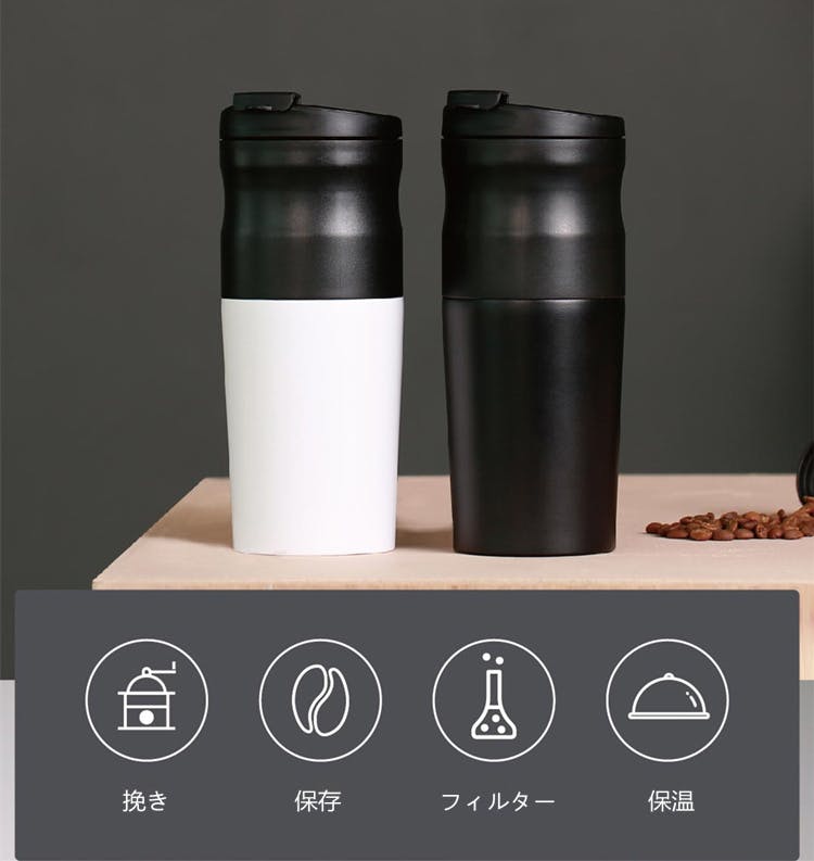 「Lavida」はコーヒーメーカー・フィルター・保温マグカップを一体化したデザインで豆とお湯さえあれば、いつでも・どこでもお好みのコーヒーを楽しむことができます。
