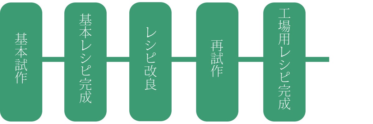 その後、協力工場において工場生産を踏まえたレシピの改良と再試作を実施し、数ヶ月掛けて製品化の目処を立てることができました。