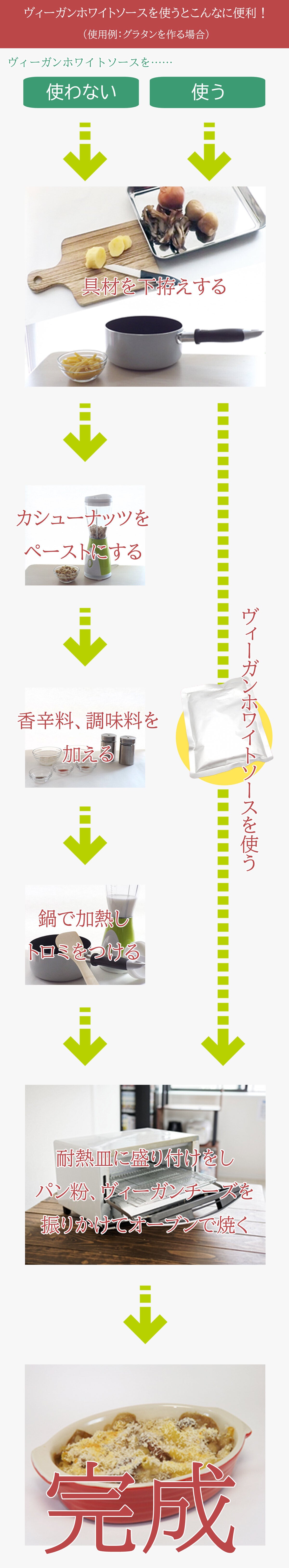 ご家庭で一から料理をする場合、牛乳の代わりに豆乳やアーモンドミルクなどを使用してヴィーガン仕様のホワイトソースを作られる方もいらっしゃいますが、なかなか手間の掛かる作業となるため忙しいときには大変です。