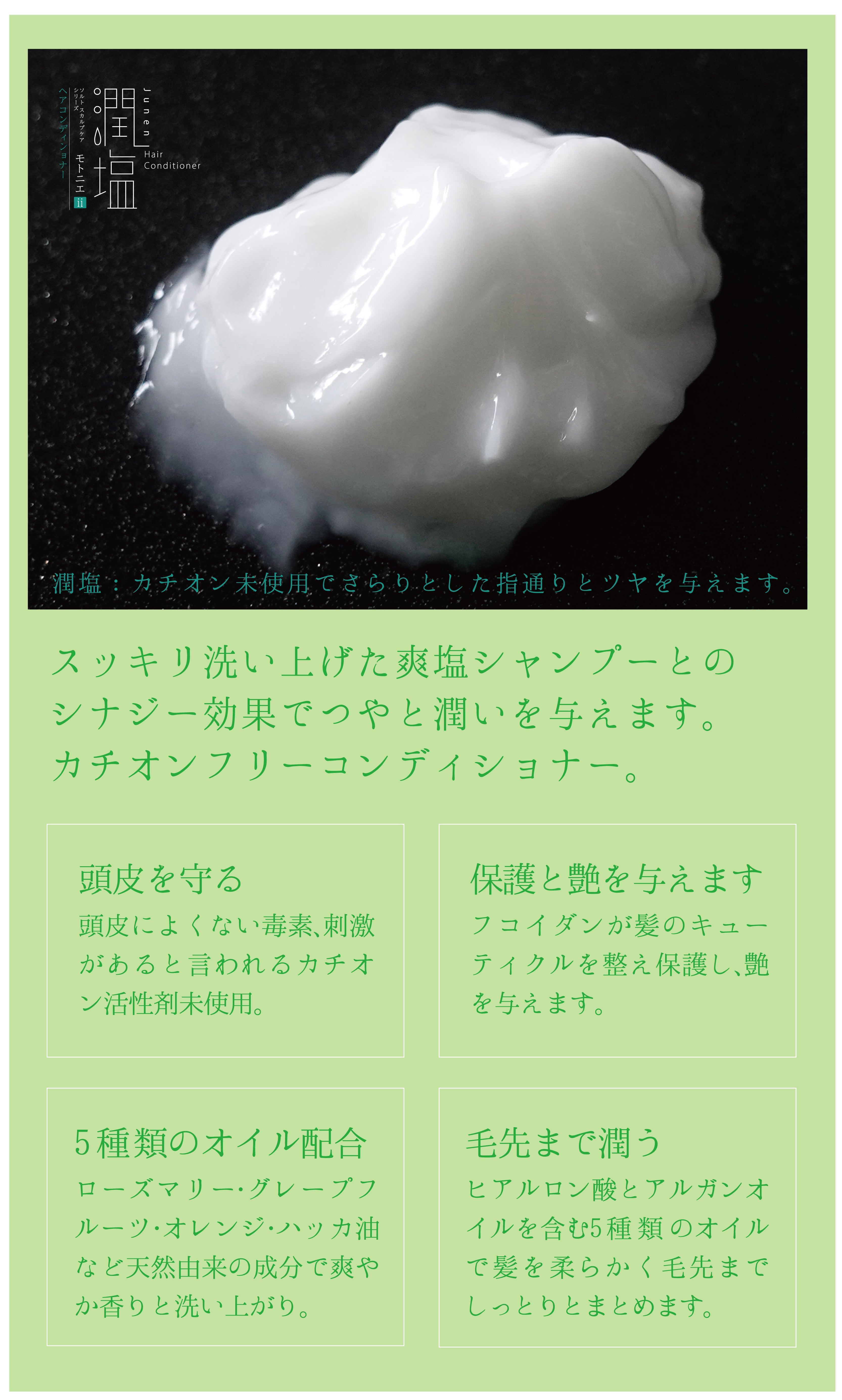 ヘアコンディショナーの潤塩は、爽塩できれいに洗浄され養分を含んだ髪の毛に潤いと毛先のまとまりを与えるために集中的に追求したヘアーコンデショナーです。頭皮によくないカチオン活性剤を一切使用していません。ヒアルロン酸で髪に潤いを与え、フコダインにより髪のキューティクルを整え保護し 艶を与えます。