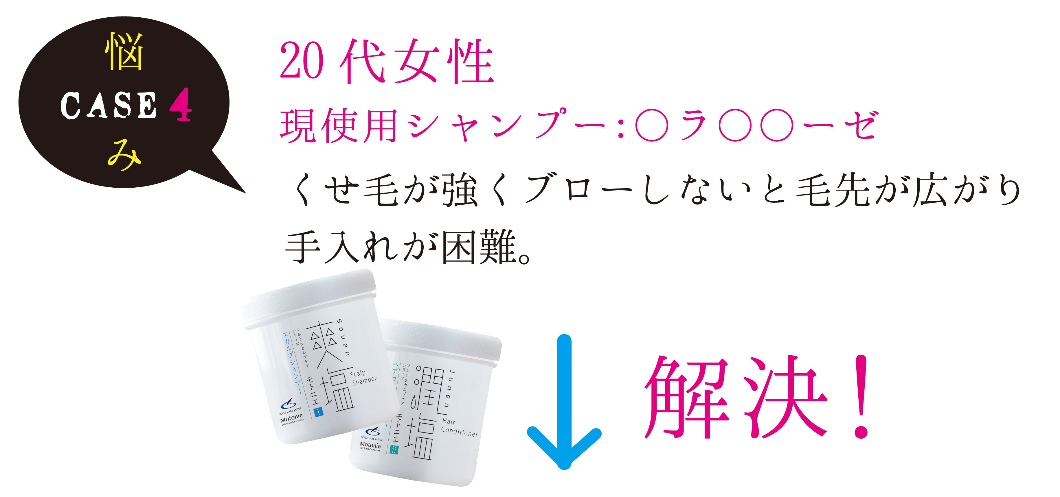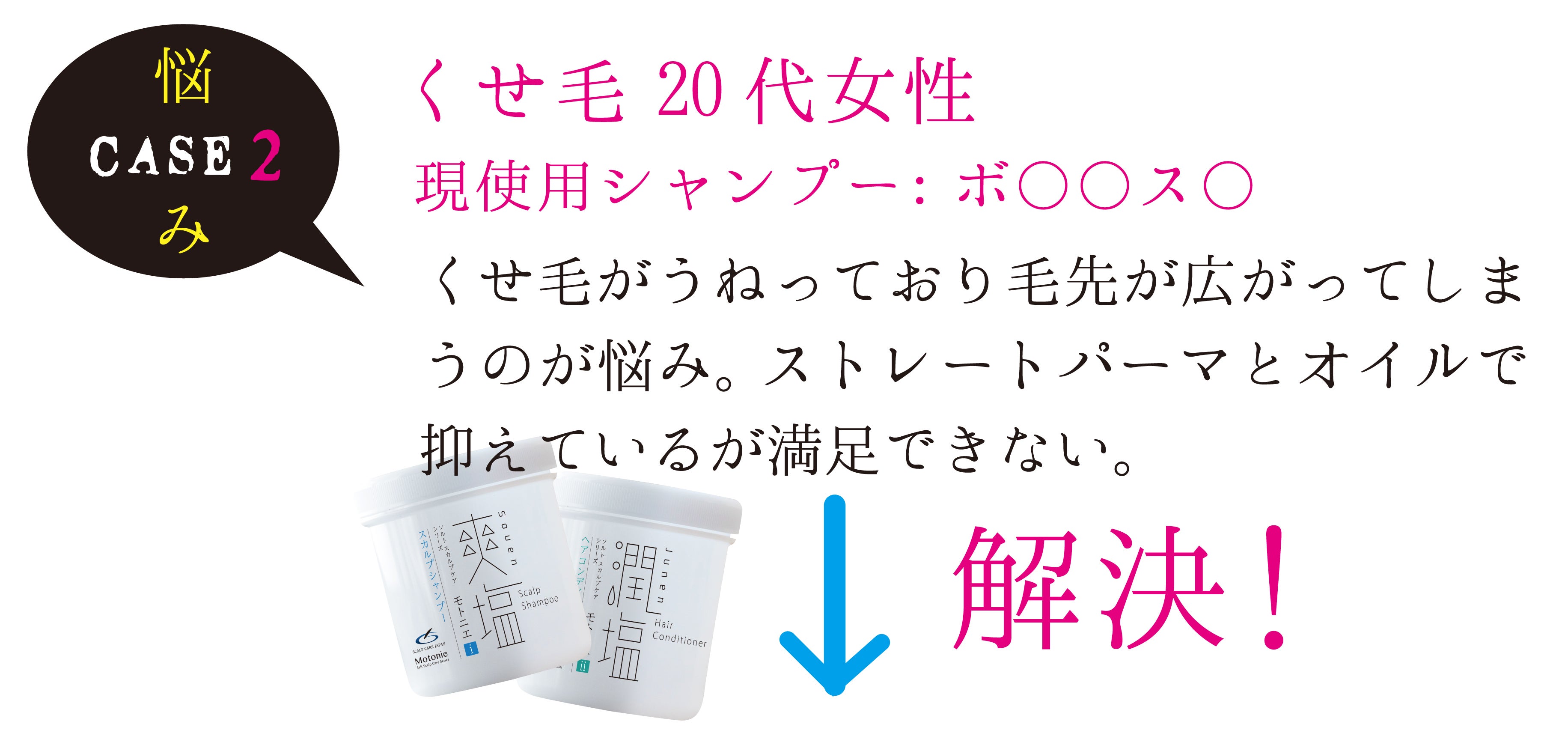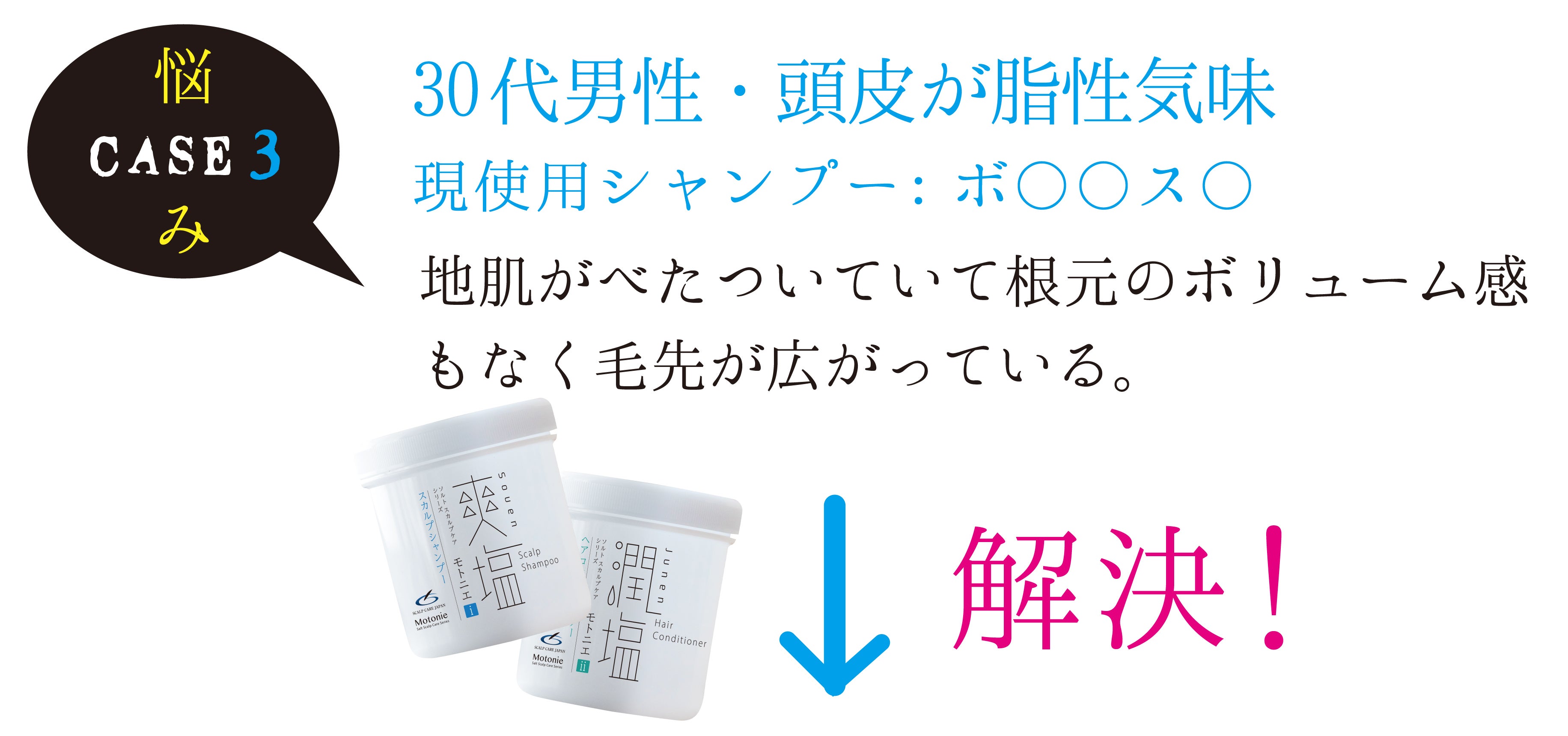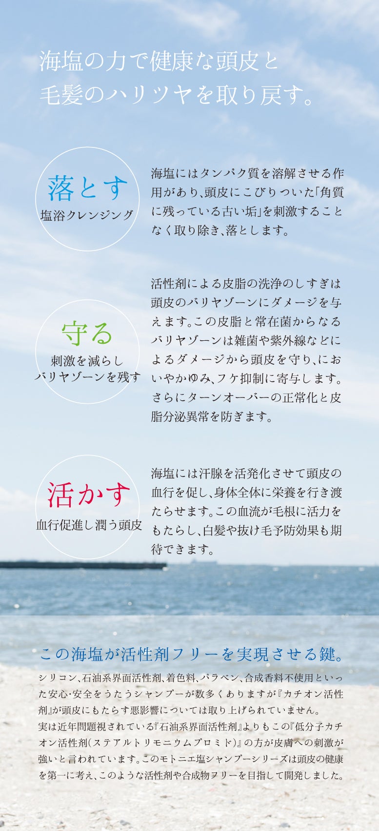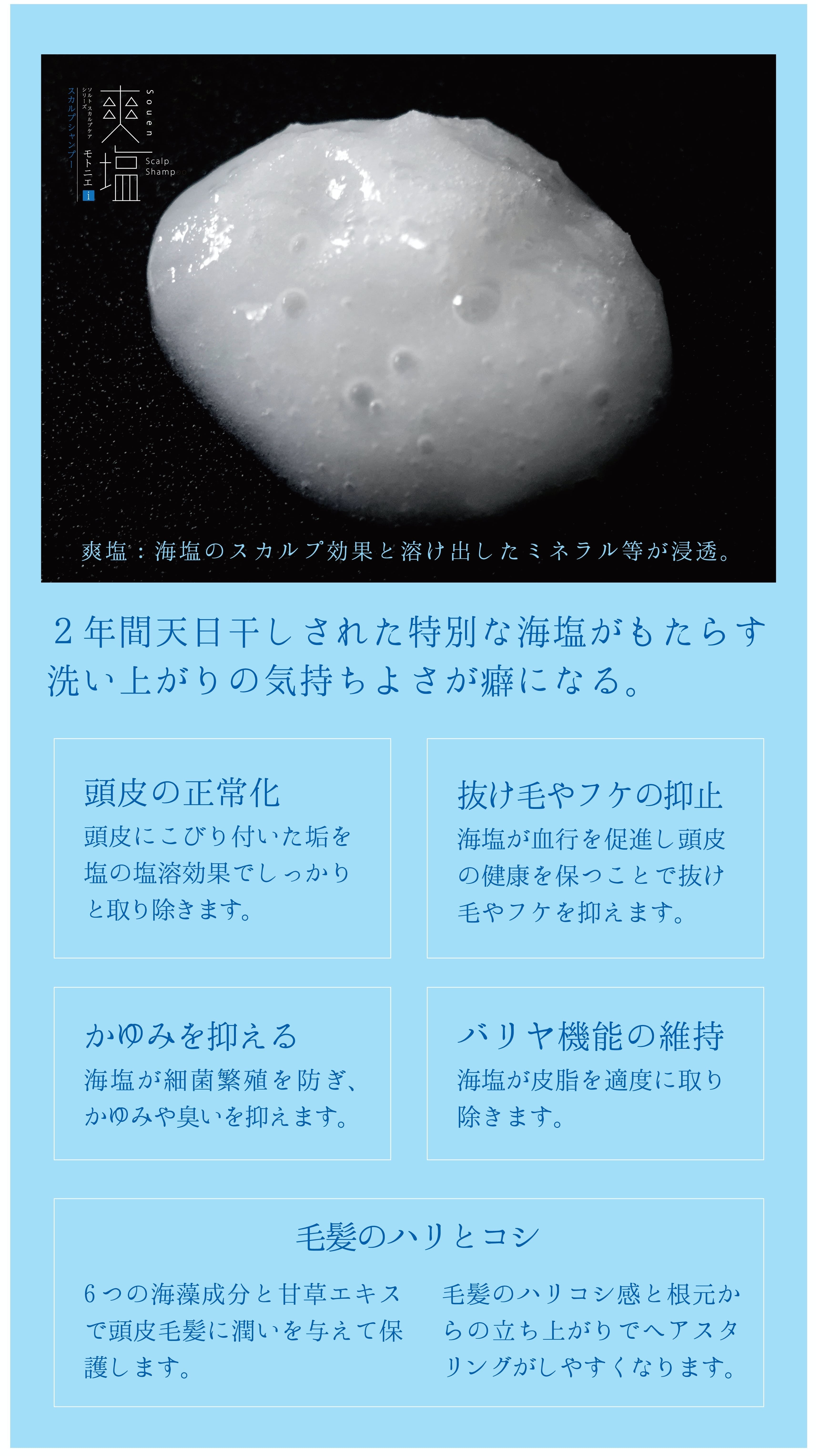 爽塩は主成分の海塩にしっかり仕事をさせるためにあまり泡立ちません。『泡は汚れを包み込んで洗い流す』というのが通説ですが、スタイリング剤などの油分は海塩だけでは落ちにくいので、低刺激性で頭皮にとても優しいコストに見合わない高価なアミノ酸系の洗浄成分(市販品にはほとんど採用されない)を採用しました。