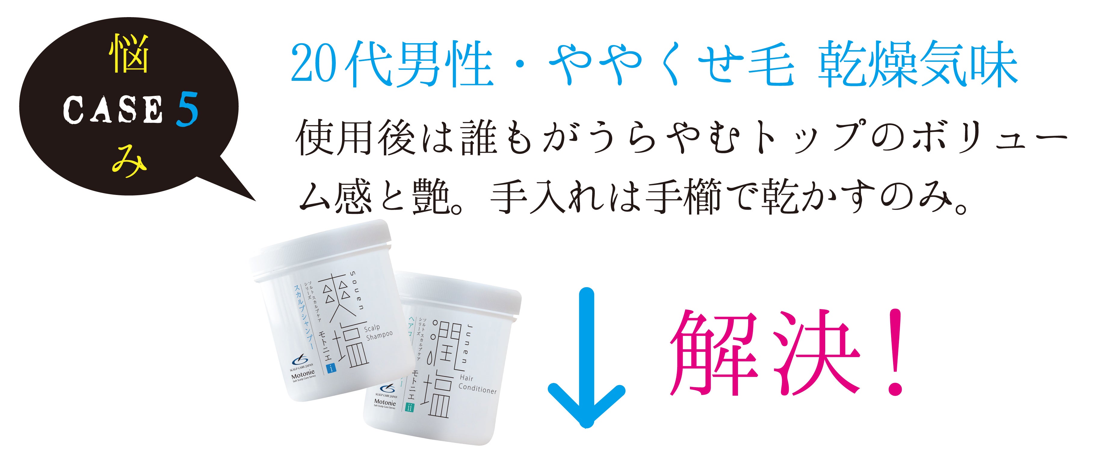 ここからコンデショナーの『潤塩』も試作を開始します。髪にボリュームが出たあとの艶と毛先のまとまりをさらにアップさせるためにはコンデショナーの必要性を感じていましたので…このコンデショナーにも徹底的にこだわりました。ほとんどのトリートメントやリンスに使われるカチオン界面活性剤は一切いれず、艶と柔軟性と毛先のまとまりを作るというコンセプトです。