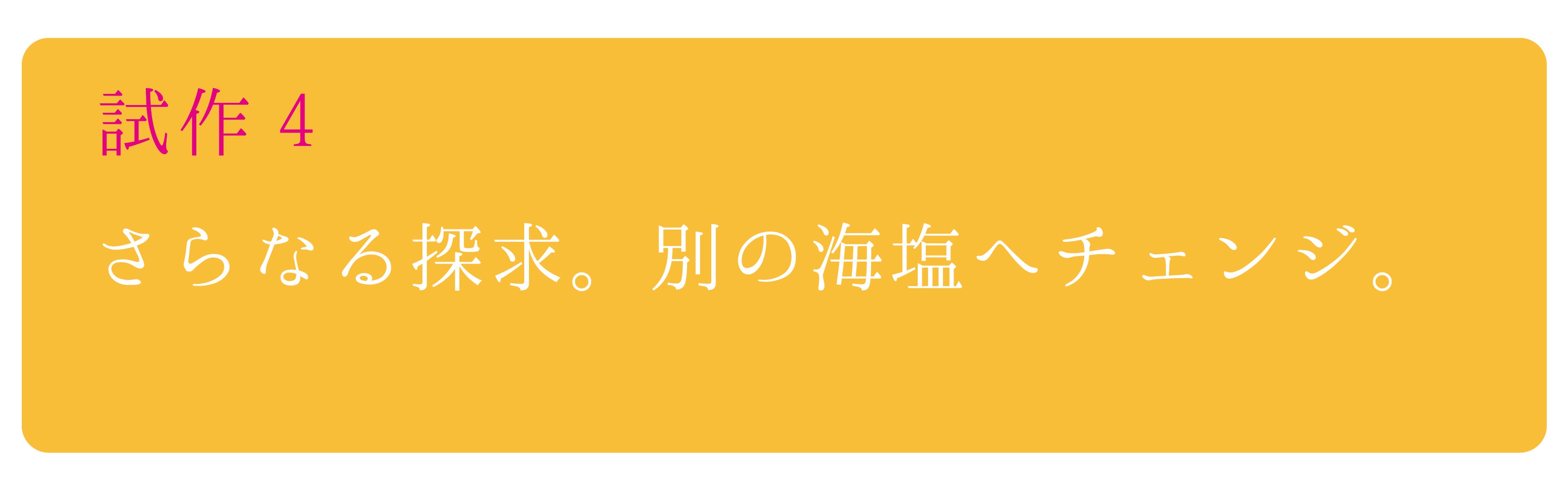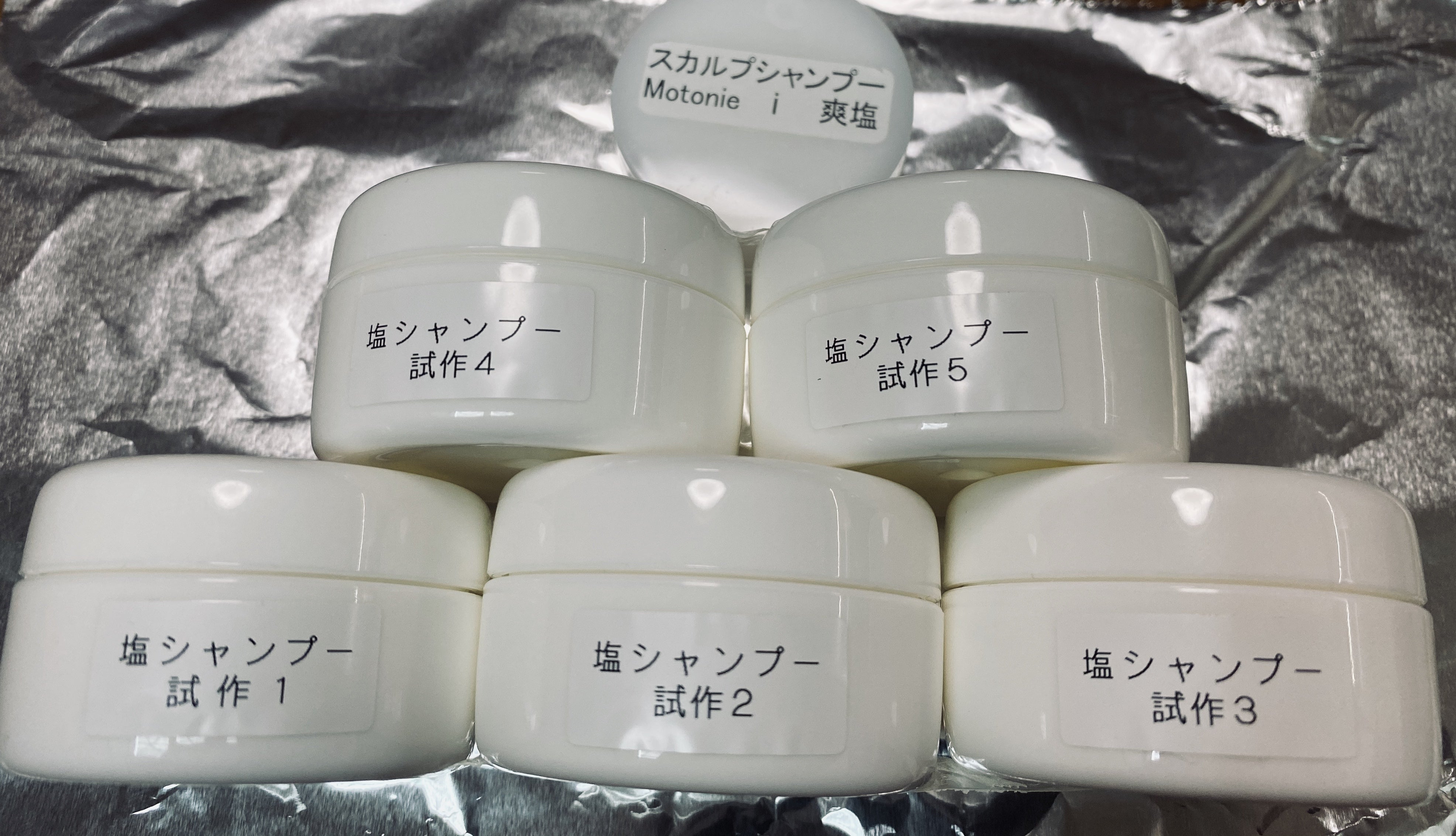 別の海塩も少しブレンドしました。前から取り寄せて食べていた海塩を少しブレンドしてもらい試作にあたりました。もちろん作った方の許可も得たうえでの試作です。そして髪のキューティクルが整うフコイダンや数種類のオイルとともに配合し試作しました。